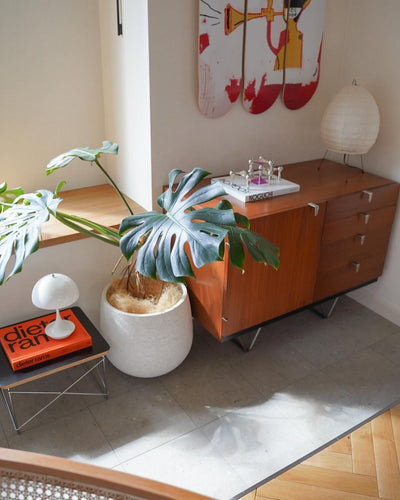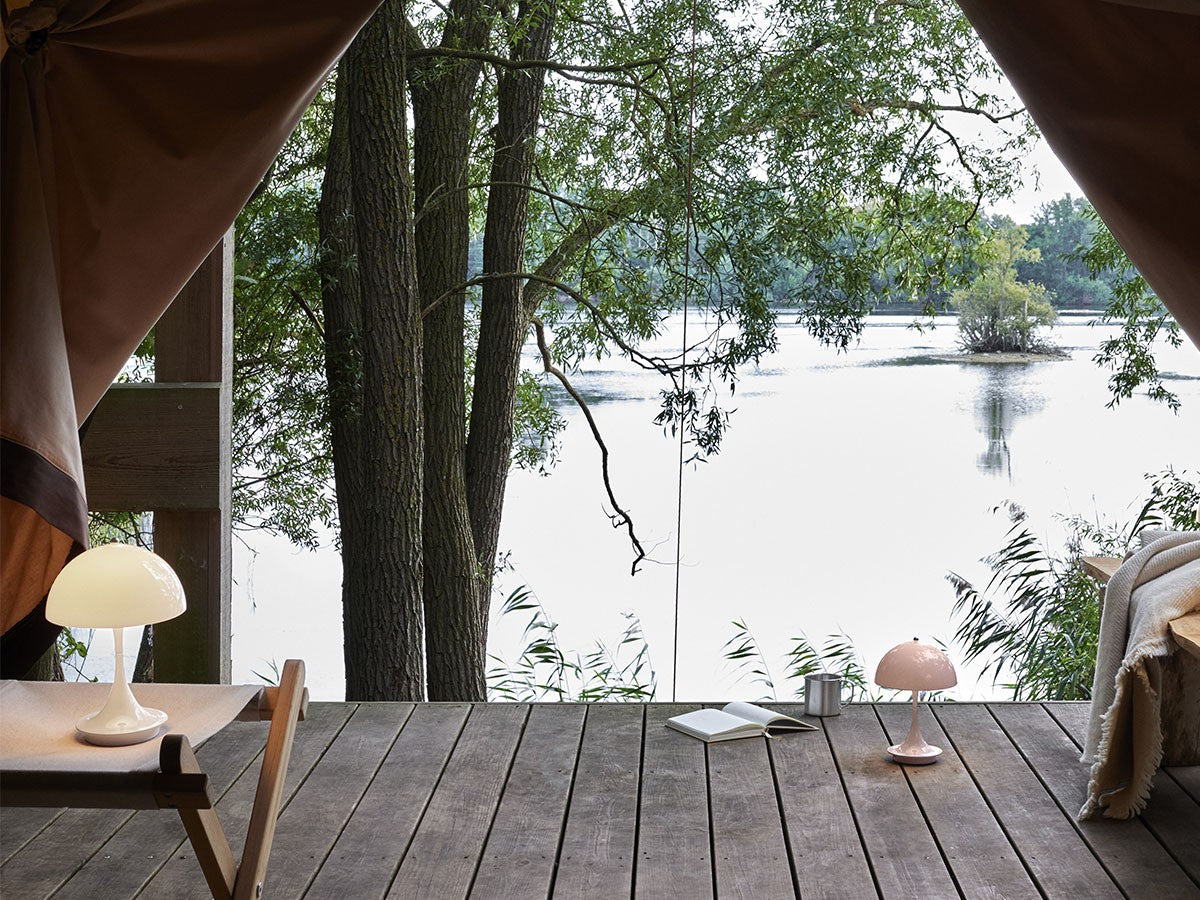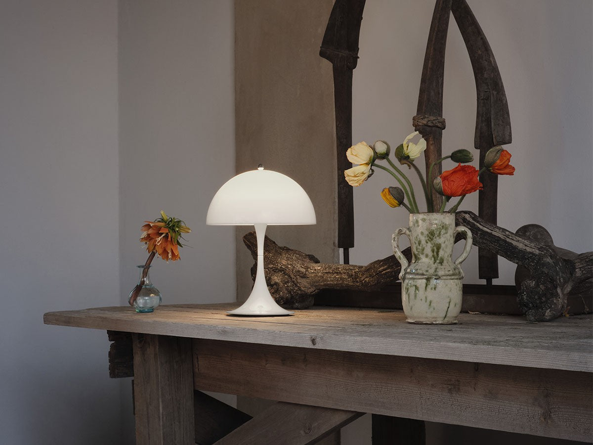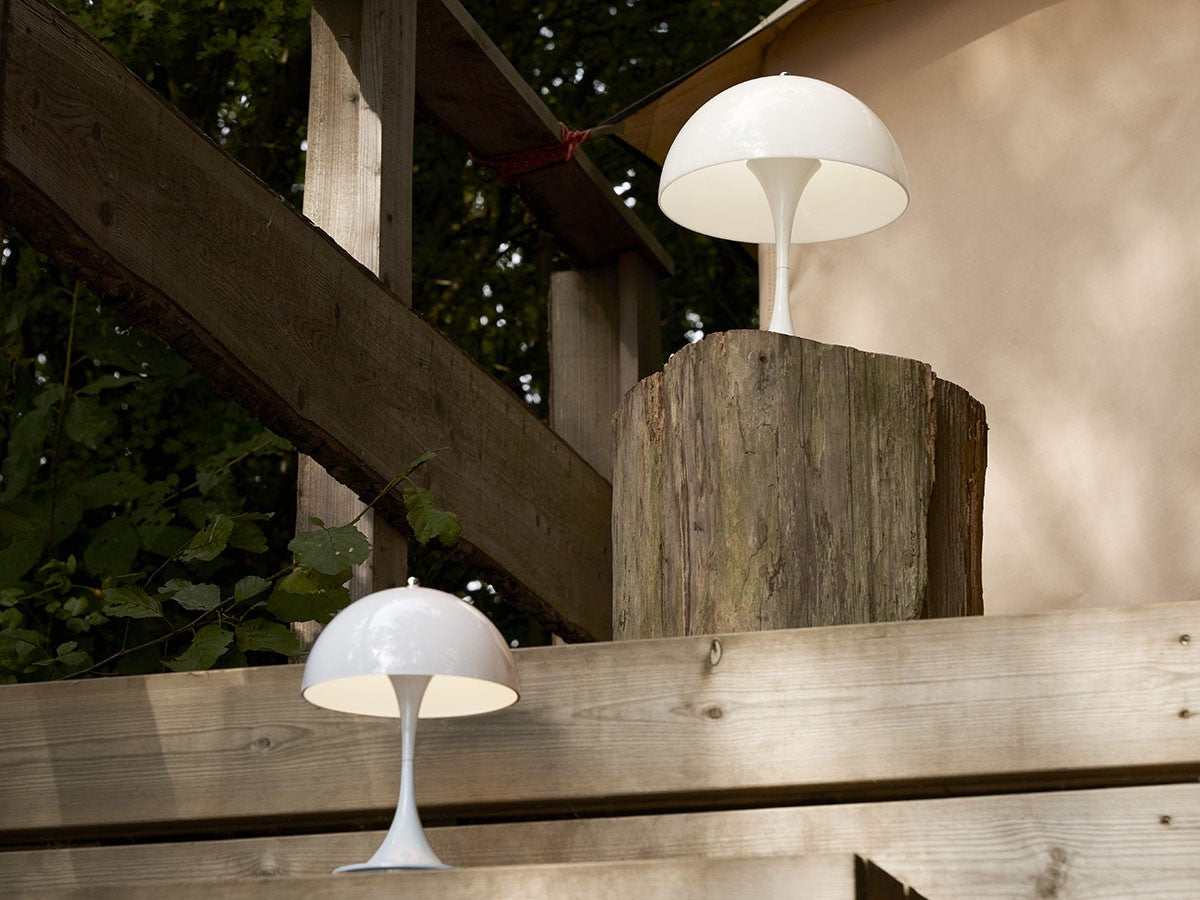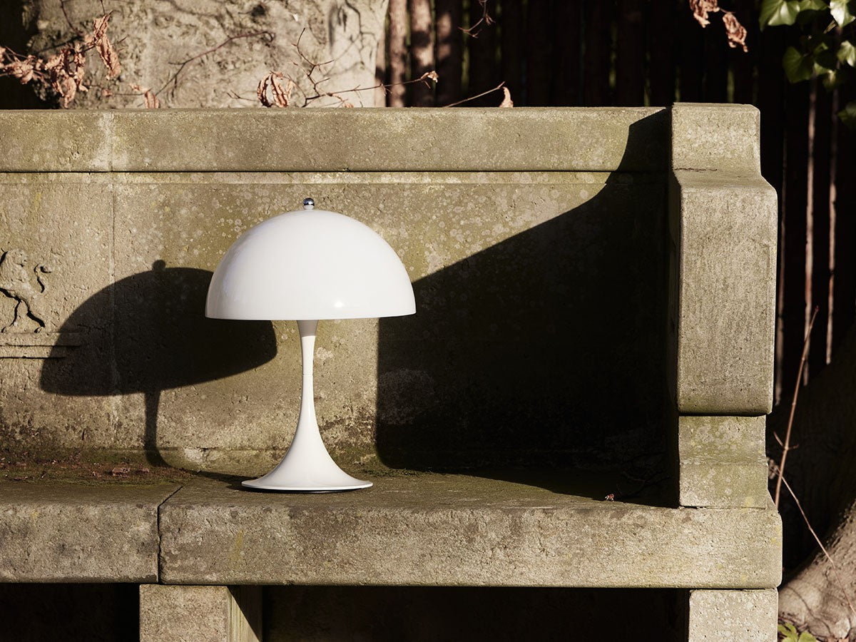 1971年、ヴェルナー・パントンが手掛けた「パンテラ」は、パントンを代表するアイコニックな照明の一つ。アクリル製の半球シェードから発する拡散光と本体部分が発する反射光によって、優しく繊細な光を作りだします。眩しさのない、柔らかく快適な光を発するこのランプは、照明が醸しだす雰囲気を追求したパントンの感性を示す好例です。オリジナルの象徴的なデザインはそのままに、直径25cmの多目的な充電式のポータブルランプになりました。有機的で遊び心のあるデザインは、オープンエアのテラス席やリビングの本棚、または廊下の暗いコーナーなど、どんな場所でも調和のとれたグレアフリーの光で満たし、落ち着きのある空間を演出します。USBケーブルでの充電の他、ワイヤレス充電器(Qi規格)にも対応しています。