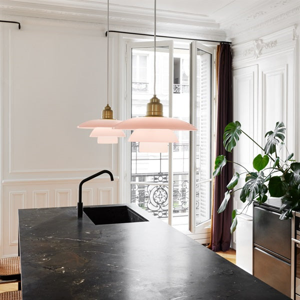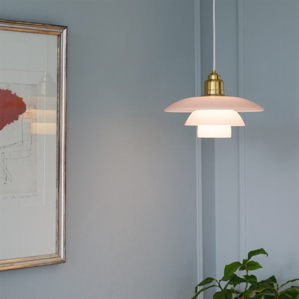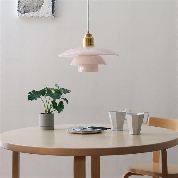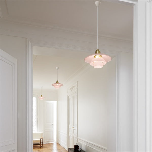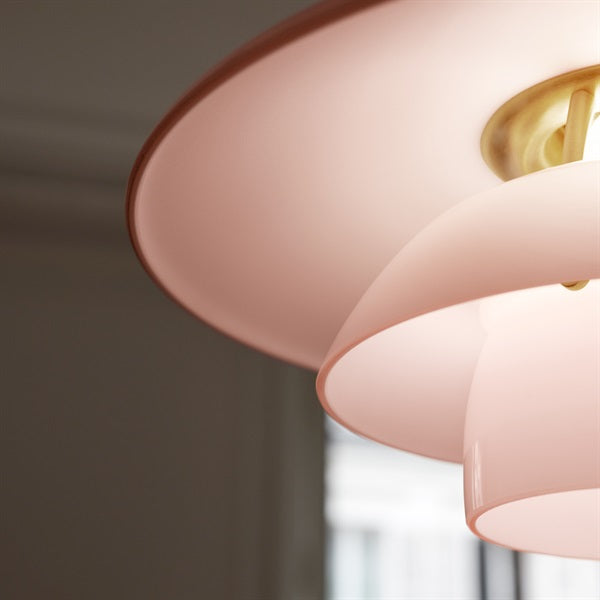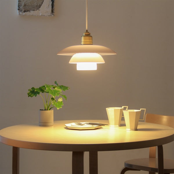 1920年代から30年代初頭のポール・ヘニングセンのオリジナル設計図にもとづくデザインで、ヘニングセンの有名な「3枚のシェードを使ったPHランプ」のアイディアを忠実に再現しています。「シェード形状に対数螺旋というカーブを用い、そのシェードを3枚組合せ電球の眩しい光(グレア)をカットし、同時に、それらのシェードは光が必要とされる場所・方向に光を効率良く反射してとどける」 という合理的・機能的なデザインは、今も価値を失なうことなく美しい光を発します。ペールローズ色のオパールガラスシェードは、光沢のある表面と、内側には白色ガラスにサンドブラスト加工を施したマット仕上げになっており、心地の良いソフトな光を均等に拡散します。 コードカラー:ホワイト