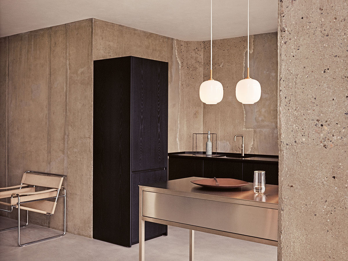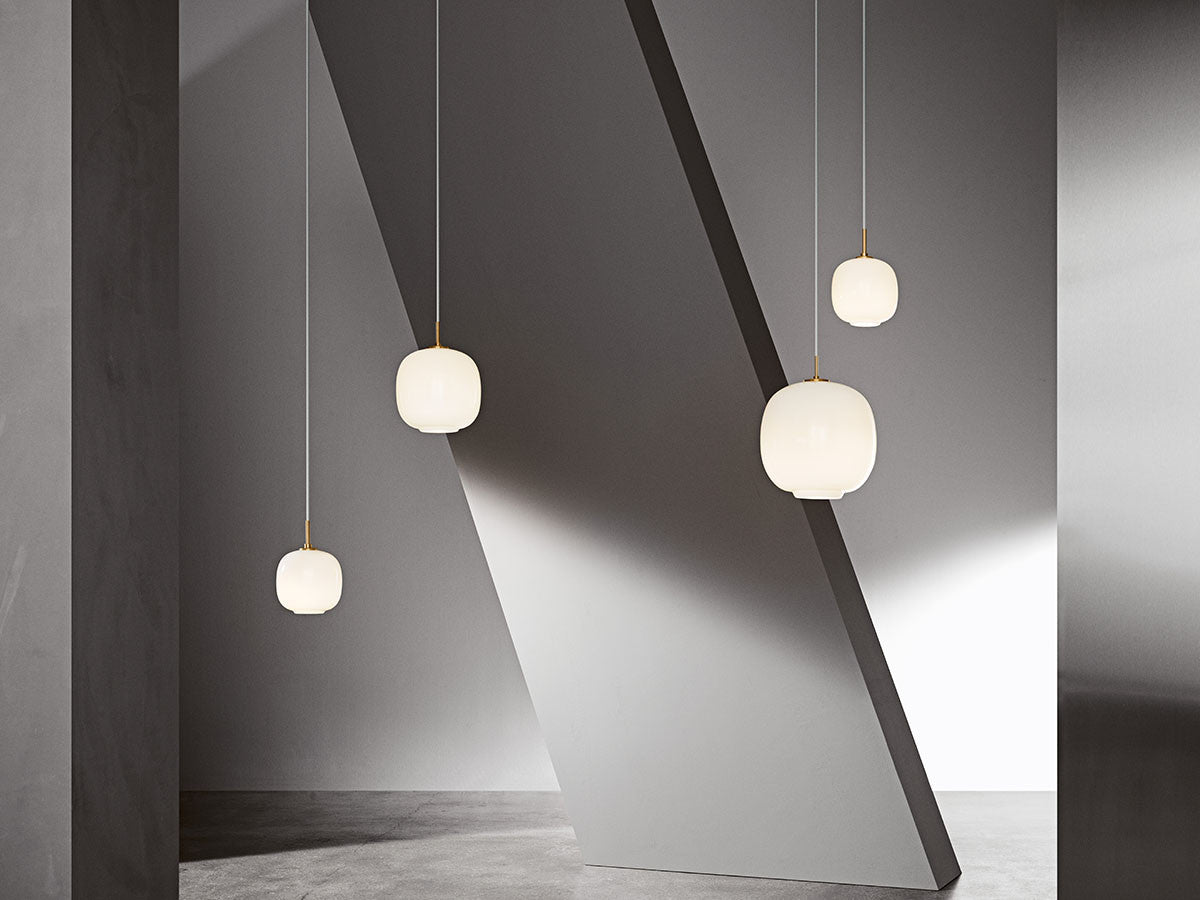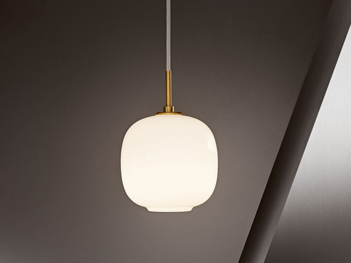 2016年、名を変えてカムバックを果たしたラジオハウスペンダント。もともと、1940年代にコペンハーゲンにあるデンマーク国営放送局(ラジオハウス)のために、デンマーク人建築家ヴィルヘルム・ラウリッツェンがルイスポールセンと共同で製作したものです。真鍮のサスペンションと乳白色の三層吹きガラスシェードの組み合わせは、オリジナルデザインそのままです。この三層吹きガラスは、外側と内側の層に光沢ある透明ガラスを用い、真中の乳白ガラス層をサンドイッチしています。拡散光を全方向に広げる全般照明として機能しますが、ガラス開口部からは下方向への直接光も放ちます。