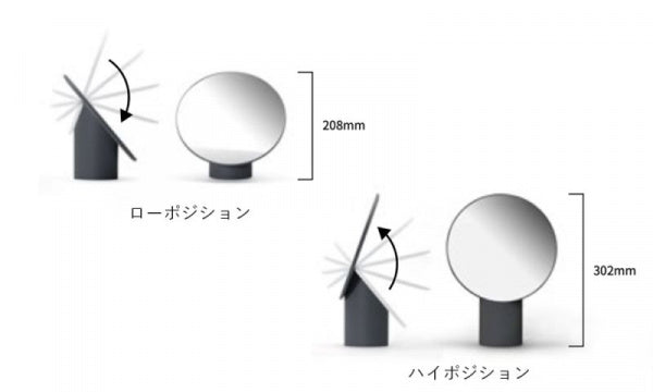 自然で純粋な色を映すことができる、特許取得のナピュアミラーを使用したメイクアップミラーは、鏡の高さを変えてメイクができます。ディテールが見やすいローポジションはお肌の手入れやメイク時に、鏡の高さが10cm上がるハイポジションはスタイリング時などに、それぞれの用途に合わせた高さと角度に調整ができます。ナピュアミラーは、青くくすんで見える従来の鏡とは違い、透明度の高いガラスと特殊反射金属加工により自然で純粋な色表現ができる特許取得の鏡です。