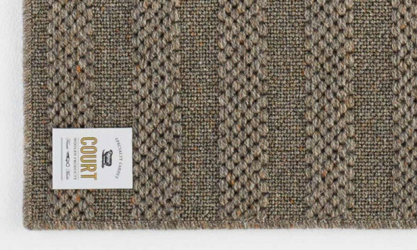 希少価値の高い英国産の羊毛で、ラグに最適な弾力性の高いウールを使用、英国政府の厳しい基準をクリアした英国羊毛公社商標が裏側に付いています。 「ウィルトン織機」というイギリスの産業革命時代に開発された伝統的な織機で織り上げているので、一般的なラグに比べて耐久性に優れています。 また、ウールには撥水性があり、汚れもつきにくく、ホコリを吸着してくれるのも特徴です。 梅雨や夏の時期でもウールは湿度を調節してくれるので肌触りもさらり、保温性が高いので冬はあたたか、一年中快適に過ごすことができます。 子育てにも安全で良い環境を作ることができます。   デザインは、フィッシャーマンセーターをモチーフに取り入れた織柄、シンプルな中にも奥行きがあります。グレーは、オレンジ・ベージュなどの糸も織り交ざり温かで落ち着いた印象です。