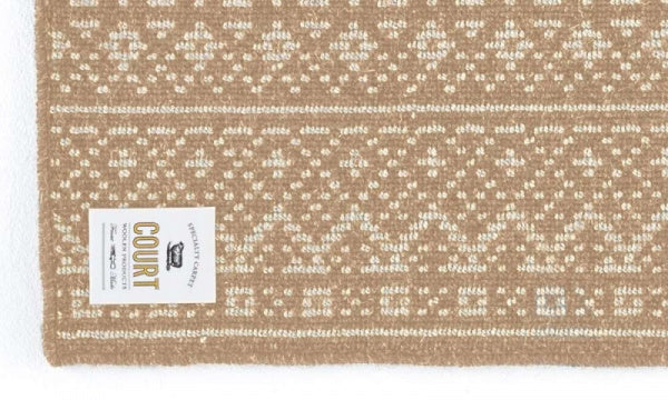 希少価値の高い英国産の羊毛で、ラグに最適な弾力性の高いウールを使用、英国政府の厳しい基準をクリアした英国羊毛公社商標が裏側に付いています。 「ウィルトン織機」というイギリスの産業革命時代に開発された伝統的な織機で織り上げているので、一般的なラグに比べて耐久性に優れています。 また、ウールには撥水性があり、汚れもつきにくく、ホコリを吸着してくれるのも特徴です。 梅雨や夏の時期でもウールは湿度を調節してくれるので肌触りもさらり、保温性が高いので冬はあたたか、一年中快適に過ごすことができます。 子育てにも安全で良い環境を作ることができます。  デザインは、フィッシャーマンセーターをモチーフに取り入れた織柄、シンプルな中にも奥行きがあります。キャメル×アイボリーは、落ち着いた色合いで優しい雰囲気があります。
