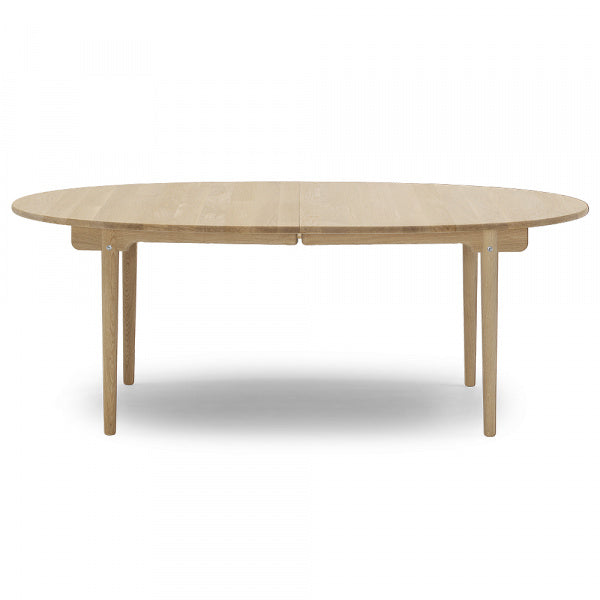 ハンスJ.ウェグナーが1962年にデザインした、楕円形の伸長式ダイニングテーブル。天板のサイズは200×115cm。素材はオークのムク材、仕上げは木材の風合いを生かしたオイル仕上げ(オイルフィニッシュ)。ウェグナーらしいエレガントな幕板の意匠が印象的なテーブルです。楕円形の天板はコーナーを気にせずに、比較的自由に椅子を配置できるという利点をもっています。伸長式のため必要に応じて伸長することが可能です。※伸長板は別売りとなります。【1962年デザイン】1962年にデザインされましたが本格的に生産が始まったのは2011年になってからです。※ご注文後のキャンセルはご遠慮ください。