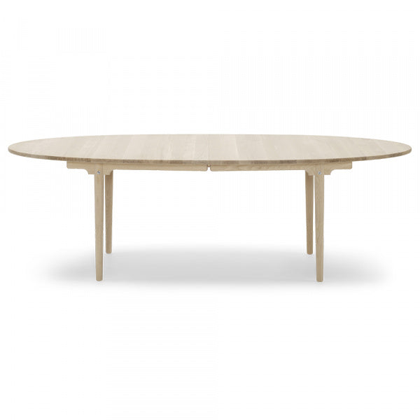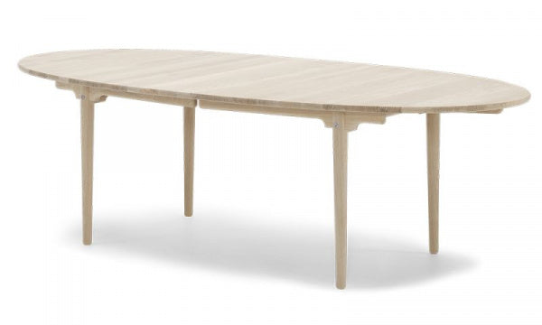 ハンスJ.ウェグナーが1962年にデザインした、楕円形の伸長式ダイニングテーブル。天板のサイズは240×115cm。素材はオークのムク材、仕上げは木材の風合いを生かしたソープ仕上げ。ウェグナーらしいエレガントな幕板の意匠が印象的なテーブルです。楕円形の天板はコーナーを気にせずに、比較的自由に椅子を配置できるという利点をもっています。伸長式のため必要に応じて伸長することが可能です。※伸長板は別売りとなります。【1962年デザイン】1962年にデザインされましたが本格的に生産が始まったのは2011年になってからです。※ご注文後のキャンセルはご遠慮ください。