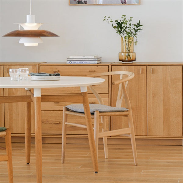 ハンス. J. ウェグナーによってデザインされ、1950年から生産され続けている名作チェアです。アルファベットの「Y」の字に見える背もたれの形状から、Yチェア(ワイチェア)の愛称で世界中で親しまれています。美しい後脚のフォルムや、丸棒を曲げて形作られた笠木の優美なラインなど、ウェグナーによるデザインの特徴がよく表れています。
