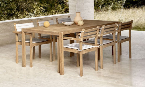 AH901アウトドアダイニングテーブルは、デンマークの建築家、アルフレッド・ホーマンがデザインを手がけたAHシリーズのひとつです。丸みを帯びたソフトなディテールとかっちりとしたラインのエレガントな組み合わせが個性的ながらも、シンプルで使いやすさも併せ持っています。滑らかな仕上がりの接合部は、熟練した職人の手作業での丹念な研磨によるものです。全11種類のバリエーションがあるAHアウトドアシリーズで組み合わせができます。人の手で積み上げられる限りのスタッキングが可能なディテールは、フォルムと機能を徹底して追求したホーマンの姿勢が現れています。※AHアウトドアシリーズには、FSC&認証を受けた未処理のチーク材を使用しています。硬くて丈夫なチーク材は変化する気候に適した木材で、天然オイルを多く含むため耐久性があり、菌類による侵食にも強いことから屋外用の家具に最適です。未処理のチーク材は、経年変化で徐々にシルバーグレーの色合いを帯びるのも特徴です。【2022年デザイン】※組立式:付属の六角レンチでお客様にて組立てをお願いいたします。