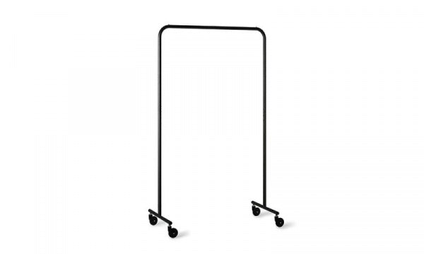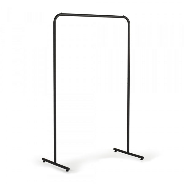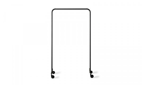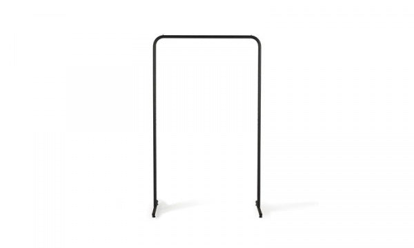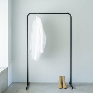 マットブラックのスチールパイプがすっきりと美しく佇み、空間に自然と溶け込む、ハンガーラック。一番の特徴は、左右の脚間をつなぐ貫(水平材)がないところ。徹底的にミニマリズムを追求し、シンプルかつ落ち着いたデザインに仕上げました。足元をすっきりさせることにこだわり、安定感や強度をしっかり保ちながら、この理想の構造を実現。足元に収納ケースを置くなど使う人によってアレンジができるのも魅力です。アパレル等のショップやエキシビションのディスプレイでも活躍します。※本製品は組立式となります。※アジャスターをキャスター(別売)に換装することができます。