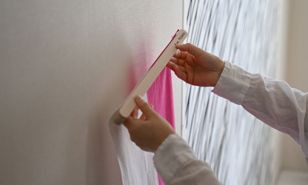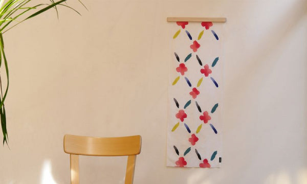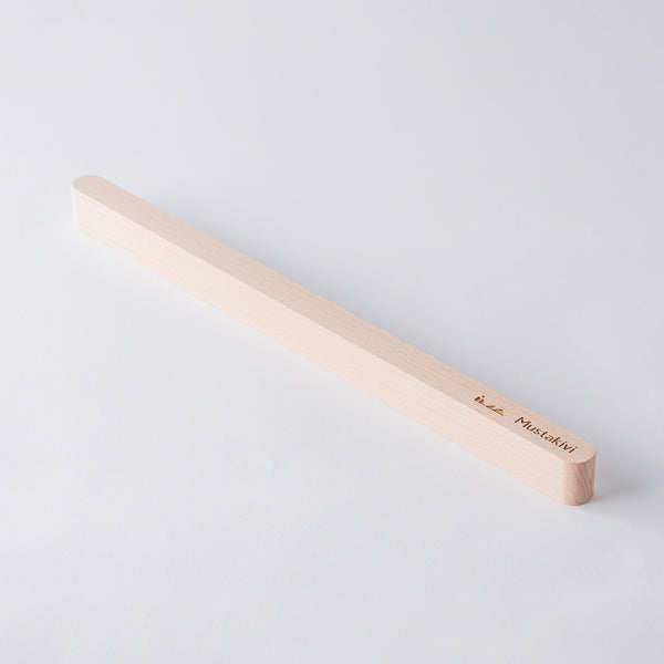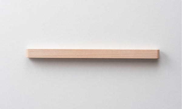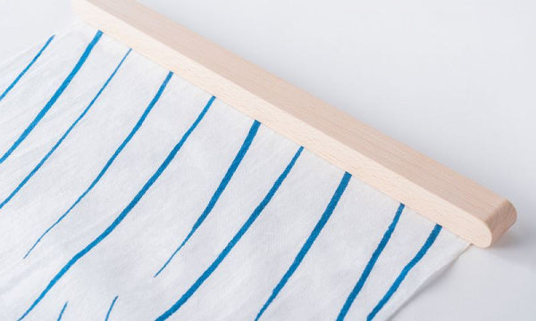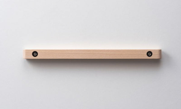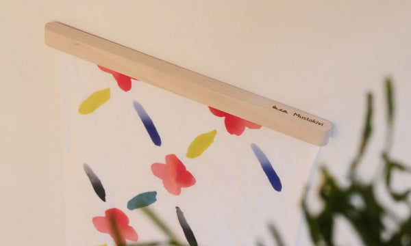 てぬぐいを飾って楽しむために生まれた「てぬぐいバー」です。素材はブナ(ビーチ)材のソープ仕上げで、あたたかみのある白っぽいナチュラルな風合い。てぬぐいの幅がちょうど収まる長さ36.5cmのバーで、裏面にマグネットが埋め込まれています。バーに同封されているスチールプレートを設置したい壁に貼り、そこにバーのマグネット部分を当てれば設置完了。あとは、好きなてぬぐいをマグネット部分とスチールプレートで挟んで、てぬぐいを飾ります。設計は、マリメッコの店舗設計や石本藤雄さんの個展の会場構成も手がけている、デザインユニット「ima」。名前は、「OKSA」。小枝を意味するフィンランド語です。設置すると、まるで小枝のように軽やかに壁に馴染みます。Mustakiviのてぬぐいはもちろん、お手持ちのてぬぐいや他のファブリック、紙を飾ることもできます。