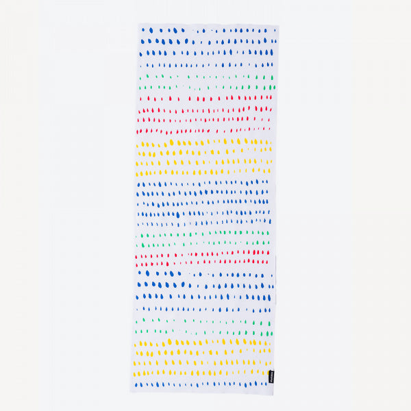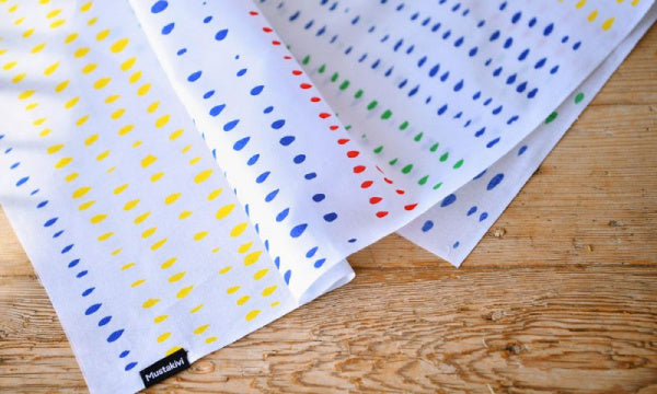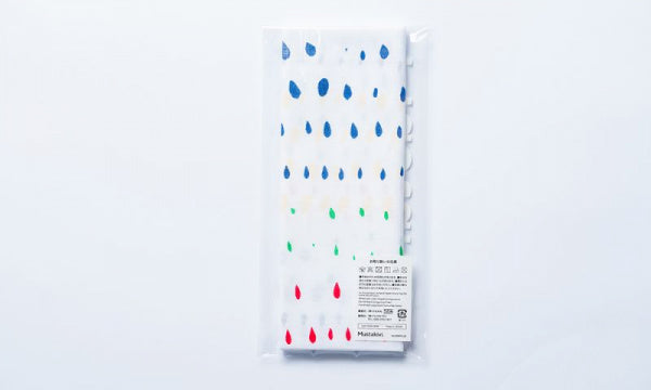 フィンランドで50年過ごした石本藤雄が、その海外生活でも愛用してきた暮らしの身近なファブリック「てぬぐい」。「いろいろあったね」は、赤、青、緑、黄色の雫のような点々が並ぶデザインです。石本がフィンランドに渡った1970年代初頭に習作(練習のために作品をつくること)として描いていた原画から、一枚の手ぬぐいにしました。原画の魅力でもある鮮やかな色を再現するため、てぬぐいの老舗「かまわぬ」で「捺染」で染めています。吸水性の高い生地のため、布巾として手や濡れたものを拭いたり、包んだり、首に巻く以外にもテーブルに敷くなど、1枚あると便利です。使えば使うほど、肌触りが良く、手に馴染みます。MustakiviとDESIGNED BY FUJIWO ISHIMOTOのタグが付いており、日常使いの布でありながら、当ブランドの商品と伝わる仕様になっていますので、ギフトとしても最適です。別売りの「てぬぐいバー」で吊るして掛け軸のように、インテリアとしてもお楽しみいただけます。※手染めのため若干の色落ち・色移りがあります。※洗濯の際は他のものと分けて手洗いすることをおすすめします。