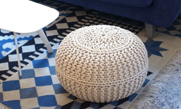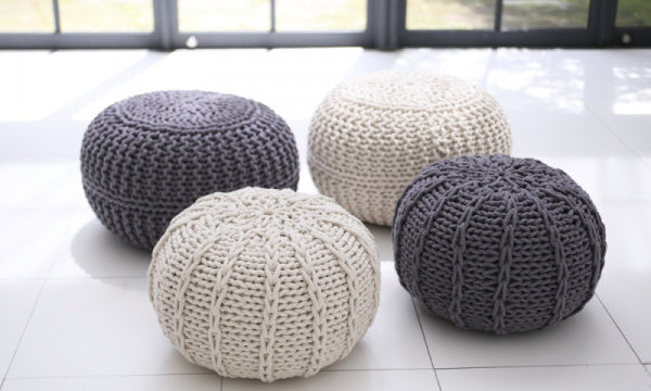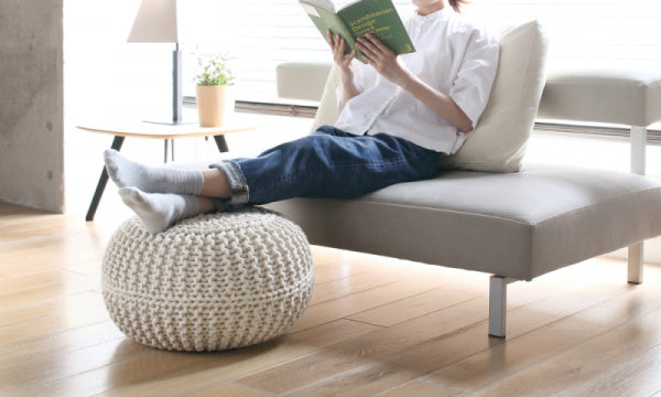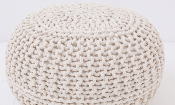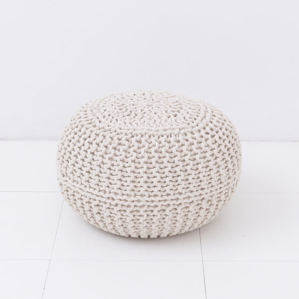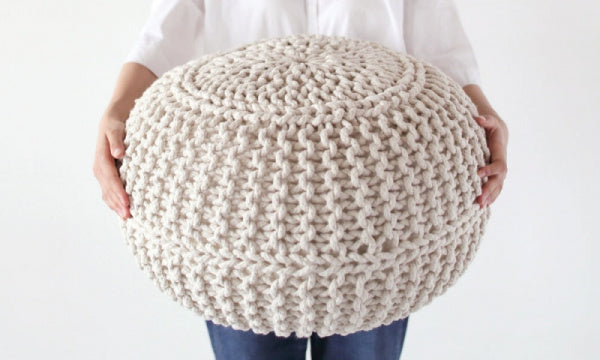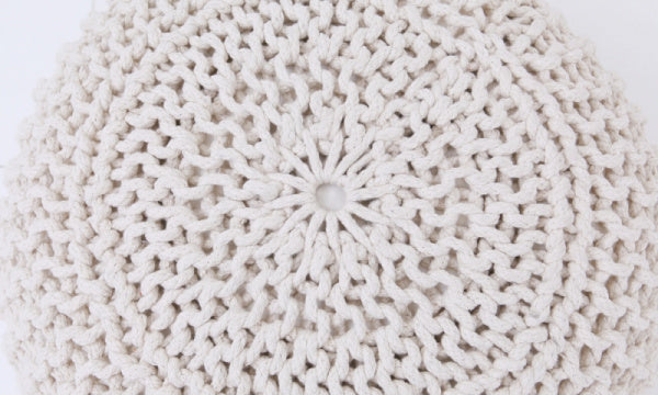 来客時のクッション、またソファのオットマンとして使えるインドのニットプーフ。100%綿を使っているのでオールシーズン使用できます。【サイズが大きいためラッピングは出来ません。】 ※商品のクリーニングの際に石油系溶剤が使われているため、開封時に少し油のようなにおいがあります。最初に風通しのよい場所に置くと匂いが薄らいでいきます。においに敏感な方は予めご了承ください。※現地職人による手編みの商品につき若干の個体差があります。※編まれた紐の部分のみを引くと、ほつれが出たり、外れたりする場合がございます。全体を持って持ち運びください。※洗濯機使用不可。カバー取り外しはできません。部分的な汚れが付いてしまった場合は拭き取ってご使用ください。