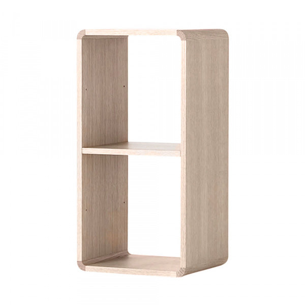 角にRをつけた2種類のブロックを横積み、縦積みとレンガのように組み合わせることで、ディスプレイを楽しめるシンプルな収納システム。壁面に置いたり、部屋の間仕切りとして置いたりと、使う方のアイデア次第で様々な「見せる収納」を構成できます。四方の角に強度補強とデザインアクセントを兼ねて同素材の無垢材を使用しています。 また2個以上を積み重ねたりする際に、ボックス同士をしっかりと連結できるよう、センプレだけのオリジナル、ジョイントパーツを作りました。センプレオリジナルジョイントパーツ2個付属。 棚板は可動式で、用途に応じて3段階に取り付けが可能です。