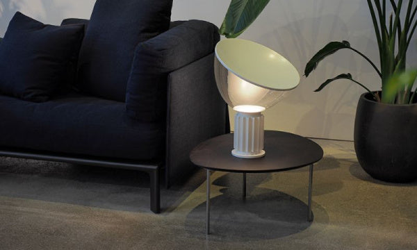 近代デザイン界に多大な影響を与えたカスティリオーニ兄弟が1958年にデザインしたテーブルランプ。象徴的なボウル状のリフレクターに光が反射し、ガラスを透過して周囲に影のない美しい光溜まりをつくります。2016年に登場した「タッチア」のスモールバージョンは、1962年のクラシックモデルにも使用されたガラス素材のリフレクターを引き継ぎ、直径約50㎝のオリジナルに対し37㎝までサイズダウンされています。カラーバリエーションや調光機能がプラスされ、より幅広い空間でお使いいただける照明となりました。点灯時にスイッチを押し続けると、100%~10%・10%~100%の段調光となり、任意の明るさで止めることができます。