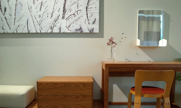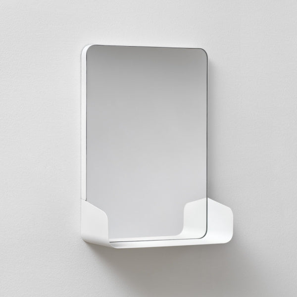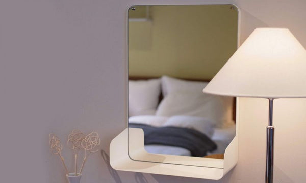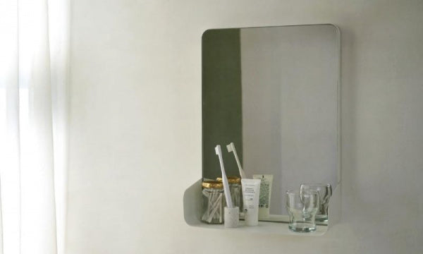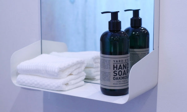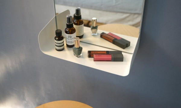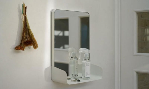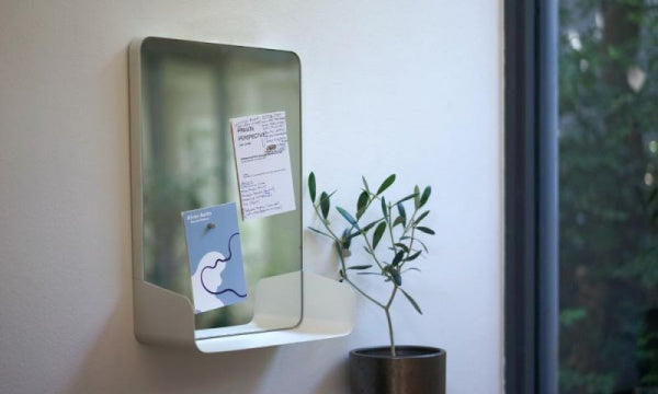 SHELFの鏡の手前には鍵やサングラス、財布などを置くスペースがあります。玄関に設置して、出かける前にふと鏡をのぞくと必要なものが自然と目に入るという、シンプルながら機能的な商品です。小さなマグネットが付属しており、メモやレシートなどを鏡に留めておくこともできます。※取り付けの際は壁面に穴を開け、アンカーを差し込みネジで固定します。壁面に取り付ける際は壁の材質をお確かめください。壁面が石膏ボードの場合は専用のアンカーをご用意ください。※棚の耐荷重は約3kgです。手前側に転び止めが付いていないので、液体の入っているものや割れやすいものを置く際はご注意ください。
