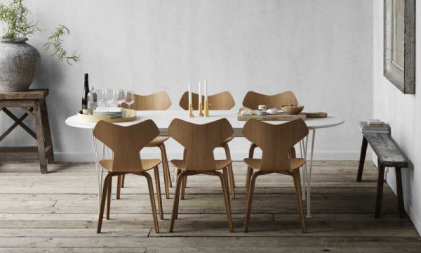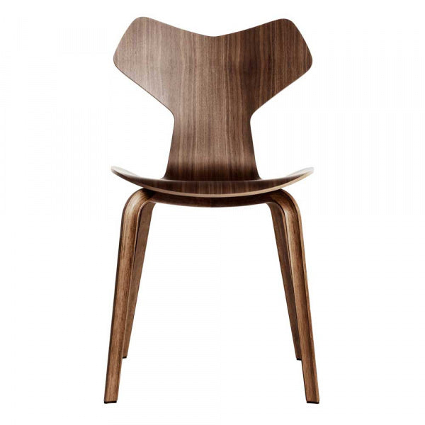 グランプリチェアは、1957年、コペンハーゲンのデンマーク工芸博物館で開催された春の展示会にてフリッツ・ハンセンにより初公開されました。同年中にミラノ・トリエンナーレに出品され、この展覧会の最高賞であるグランプリを獲得しました。グランプリチェアのウッドレッグは、ヤコブセンのほかの成形合板のチェアのスチールベースにならって、滑らかに角度を描きながら広がります。このモデルは、ヤコブセンがデザインしたもののなかでも珍しい、ウッドレッグの椅子です。ウッドレッグ仕様のグランプリチェアは、スタッキングできません。デンマークのFRITZ HANSEN(フリッツ・ハンセン)社の商品です。【1958年デザイン】