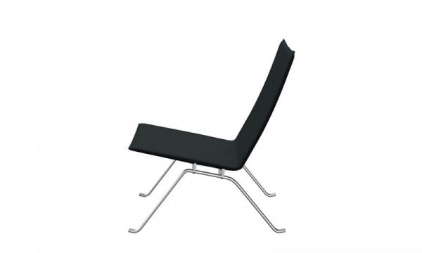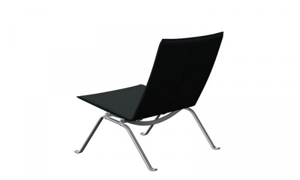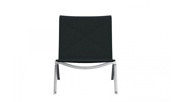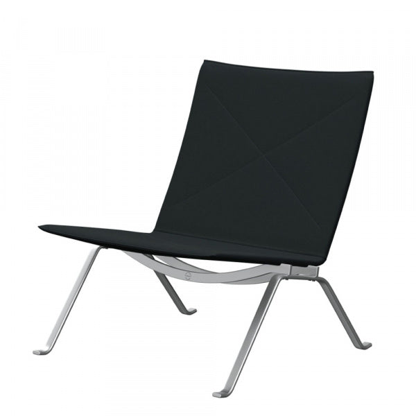 ポール・ケアホルムは近代建築の巨匠ミース・ファン・デル・ローエに大きな影響を受けていました。「PK22」はローエの傑作チェア「バルセロナチェア」を超えるべくデザインされたそうです。4片のスチールは、シート面の下の二重のクロスビームで2つの平行した面に接合されています。PK25とは異なり、シート前部分の硬い縁に煩わされることなく、身体を休めることができます。凸状の曲線の座面と凹状の曲線の背面は、ケアホルム作品によくみられる主題となりました。無駄を削ぎ落とした機能美は多くの反響を得て、1957年のミラノ・トリエンナーレでグランプリを獲得。時代を超える名作として知られています。デンマークのFRITZ HANSEN(フリッツ・ハンセン)社の商品です。【1956年デザイン】