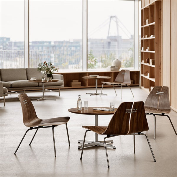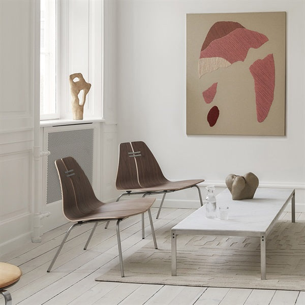 1954年にポール・ケアホルムがデザインした「PK23ラウンジチェア」は、独特のスプリットシートが特徴で、モダンな美学と快適さを兼ね備えたデザインです。当初、ポールケアホルムがフリッツハンセン退職後に務めた建築事務所・FLスミス社の本社オフィスプロジェクトの食堂用に2種類デザインが構想されましたが、当時は生産されることはありませんでした。後にケアホルムの妻ハンネがルイジアナ近代美術館での展示のためにプロトタイプを承認し、70年の時を経て初めて生産されることになりました。彫刻的でモダンな形状が特徴で、背もたれとシートは積層合板シェル、ベースはステンレススチールまたはブラックの粉体塗装スチールで構成されています。PK23は、ケアホルムの初期作品と後のミニマリストデザインを橋渡しする作品で、クラシックおよびコンテンポラリーなインテリアの両方に適しています。デンマークのデザインを象徴する彫刻的な形状と、遊び心のある表現が空間に芸術的なアクセントを加えます。さらに、ポール・ケアホルムの作品を手頃な価格で手に入れることができる貴重な機会であり、コレクタブルなアイテムとしても価値があります。商業施設や住宅など、様々な空間に適したデザインです。【1954年デザイン】
