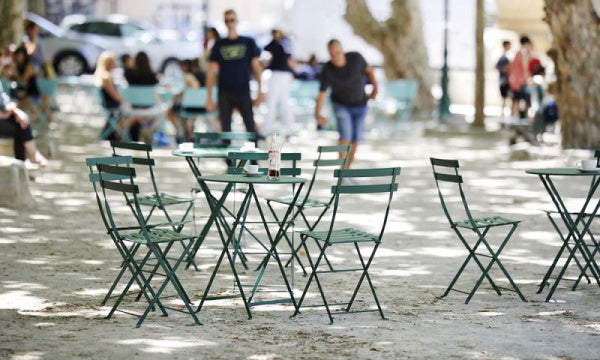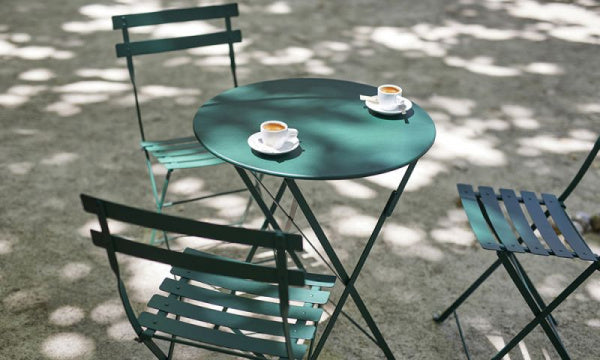 フランスらしい優しいペールカラーのガーデンテーブルは、樹木の緑にとてもよくとけ込みます。折り畳み式。