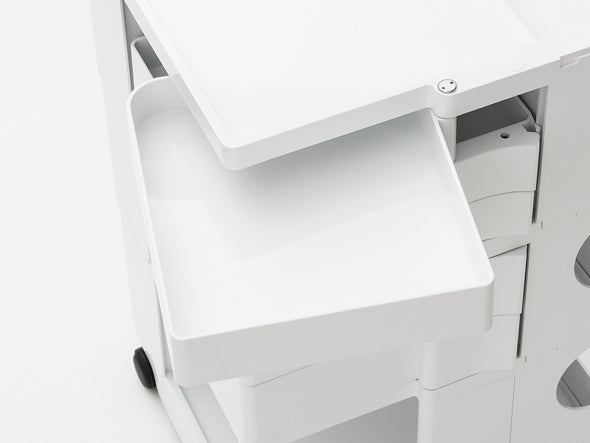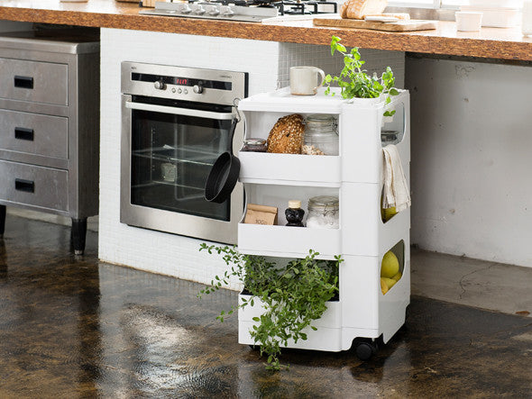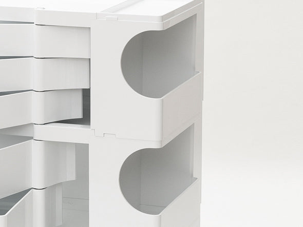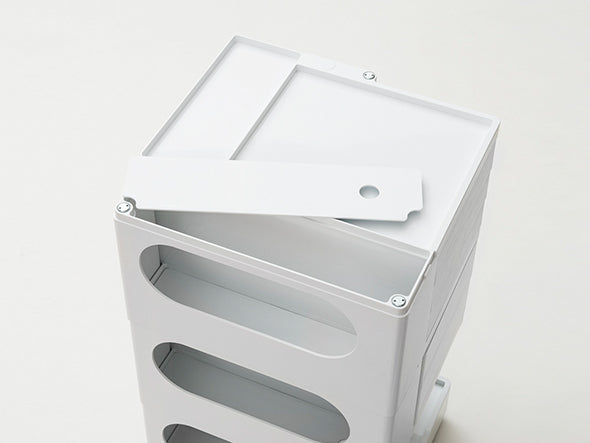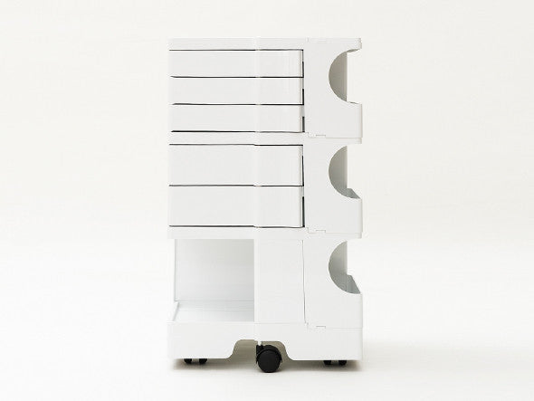 ボビーワゴンは、キャスター付きの本体を回転させることで側面4面すべてを効率的に使える、デザイン性と機能性に優れた収納家具です。180°回転するトレイや、ボトル類の保管に適した奥行きのあるポケットなど、機能性に富んだ収納スペースが随所に工夫されています。4段ワゴンは、とにかく収納したい小物を整理したいという方におすすめ。収納力は他の仕様に比べて格段にアップ。美容室などの立ち仕事にも適しています。ABS樹脂製で汚れの拭き取りも簡単です。イタリアンデザインの黄金期1960年代を彗星のごとく駆け抜け、数多くのプロダクトを残して41歳の若さでこの世を去った天才デザイナー ジョエ・コロンボが1970年にデザインし、その後のロングセラー商品として40年以上経った現在でも世界中で愛用されています。SMAU賞(イタリア)を受賞したほか、MoMA(ニューヨーク近代美術館)のパーマネントコレクションにも選定されているプロダクトデザインの名作です。