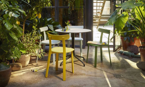 一見、ヨーロッパで昔から馴染み深い木製チェアのようなAPCチェア。ですが、実際にはポリプロピレンを活かしながら、デザインと機能性が追及されています。平らなパーツは1つ1つ成形され、座面の表面は有機的なラインを描き、背もたれは伝統的な木製チェアと比較し、より薄いパーツになっています。その結果、コンパクトでエレガントなデザインを実現しました。一方でフレーム自体は丈夫で曲がりにくいポリプロピレンからできており、座面部分と背もたれは座る人の身体に馴染み、ゴム製のシャフトが軸となり、柔軟にしなることで、非常に快適な座り心地です。チェアは2種類のプラスチックの素材を用い、暗いトーンの座面とわずかに明るいトーンの背もたれの2色を組み合わせた新しい配色を試みています。これにより、クラシックな形の中にも現代的なニュアンスを感じさせるデザインが出来上がりました。丈夫で耐久性のある素材のためアウトドアでの使用も可能。ホームユースに限らずカフェやレストランなどパブリックスペースにも適しています。【2016年デザイン】※グライドは脚先(床設置面)に付いている部品です。【送料無料】