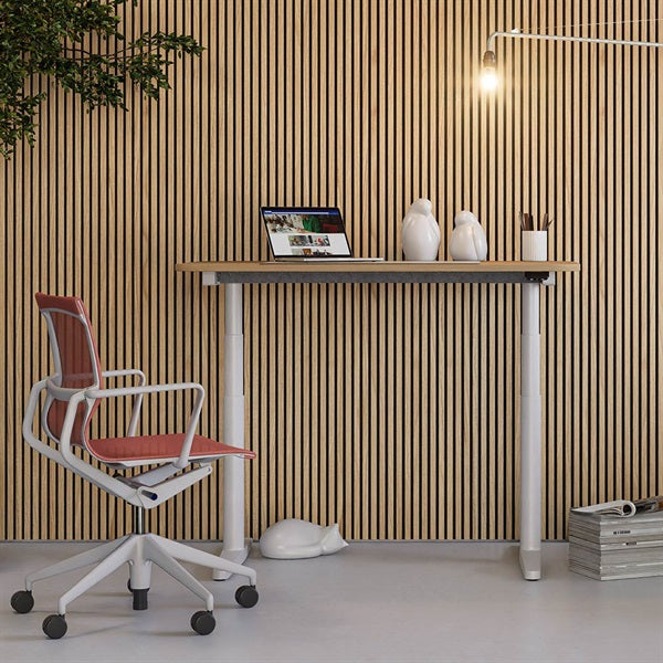 タイド 2 ホームデスクは、オフィス向けタイド2デスクファミリーの機能性を活かしつつ、ホームオフィスにも最適なモデルとして開発されました。長時間同じ姿勢で作業を続けることは健康に悪影響を及ぼすため、オフィスでも自宅でも座る・立つ姿勢を切り替えながら作業することが大切です。電動昇降機能により天板の高さを調整でき、技術的な部品は目立たないよう巧みに隠されています。フォルムや素材はカジュアルで落ち着いた印象を備え、さまざまなインテリアに溶け込みます。