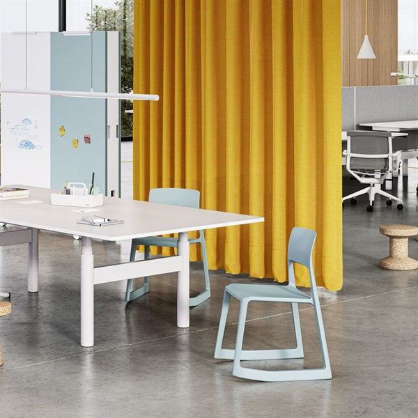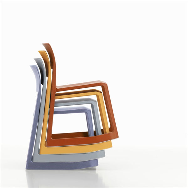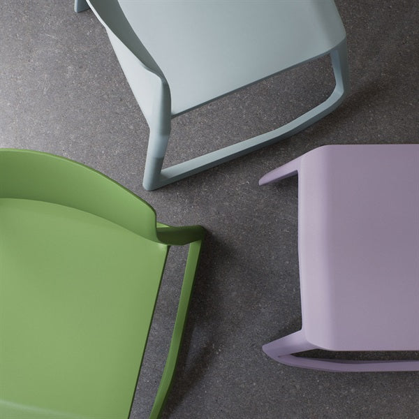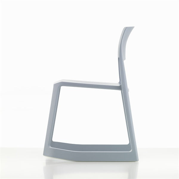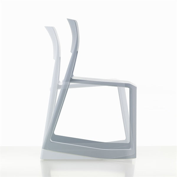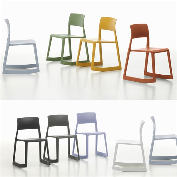エドワード バーバー&ジェイ オズガビーは、2011年に発売され、高い支持を得たこのデザインを改めて見つめ直し、再生プラスチックを利用したバージョン「ティプトンRE」を開発しました。この再生プラスチックは、様々な家庭からの廃棄物、特にプラスチック包装からリサイクルされたもので、石油から作られるプラスチックに比べ、二酸化炭素排出量を54%削減し、また、燃料の消費も大幅に削減することが可能です。再生プラスチックにガラス繊維を混合した素材が用いられたこのティプトンREは、ヴィトラの高い品質基準をクリアした、安全で丈夫な椅子です。ダークグレーの色合いは、再生プラスチック本来の色で、ところどころに細かい斑点が見られるのが特徴です。ティプトンREは、100%リサイクルが可能で、4脚までスタッキングすることができます。