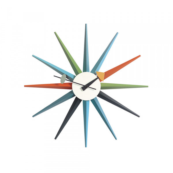 サンバーストクロックは1957年にジョージ・ネルソン(George Nelson)によって製作されました。 太陽が光輝くような様をモチーフにしたような、遊び心あふれるデザインとなっております。 突き出すような光の線は、カラフルにペイントされており見るものを楽しくさせてくれます。ムーブメント:ドイツ、ユンハンス社製。【1948-1960年デザイン】【送料無料】