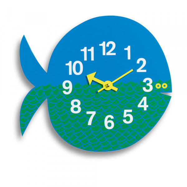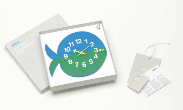 動物たちが色鮮やかにデザインされたジョージネルソンのウォールクロック。子どもたちに時間を知る遊び心と明るい毎日を提供してくれます。海に漂うおさかなのモチーフ。バイカラーが特徴的。ムーブメント:ドイツ、ユンハンス社製。【1965年デザイン】【送料無料】