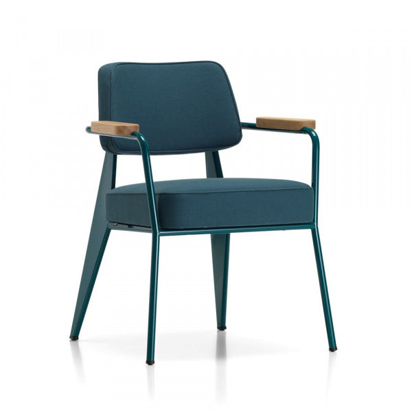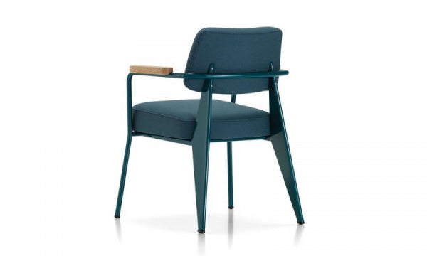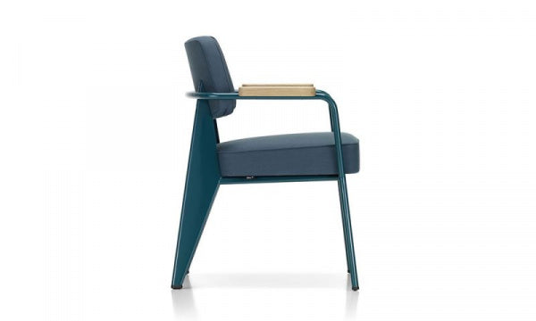 合理的で無駄のない美しい構造のデザインは、ジャン・プルーヴェらしさが表れています。ダイニングチェアや、ホームオフィス用のチェアとしても適しています。「twill(ツイル)」は、心地よい触感で、耐久性、耐摩耗性に優れています。twillは18色からお選びいただけます。※写真はtwill「03ブルーグレー」となります。アームは、ソリッドアメリカンウォールナット、ダークステインドソリッドオークも選択可能です。グライドはオプションで、ハードフロア用フェルトグライドにも選択可能です。