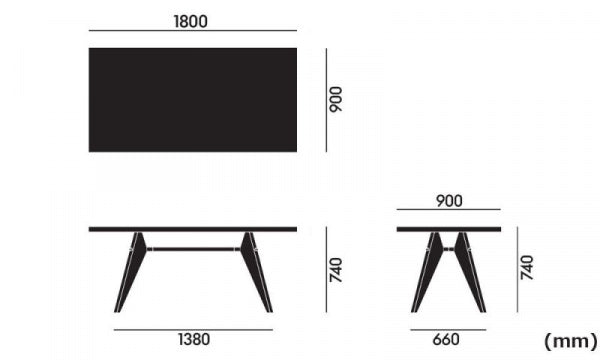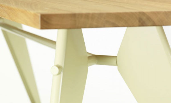 フランスのデザイナーであり建築家、そしてエンジニアでもあったジャン・プルーヴェは、1950年に Maison Tropicale のために「EM ターブル」をデザインしました。 彼の構造哲学に基づきデザインされたこのテーブルは、細部にわたりその哲学が貫かれています。傾斜のついた脚は天板の下に沿ったバーと連結し、天板にかかる重さを床へ逃がせる構造になっています。これは、一般的に建物のような構造体でしか見られないような仕組みです。組立式。