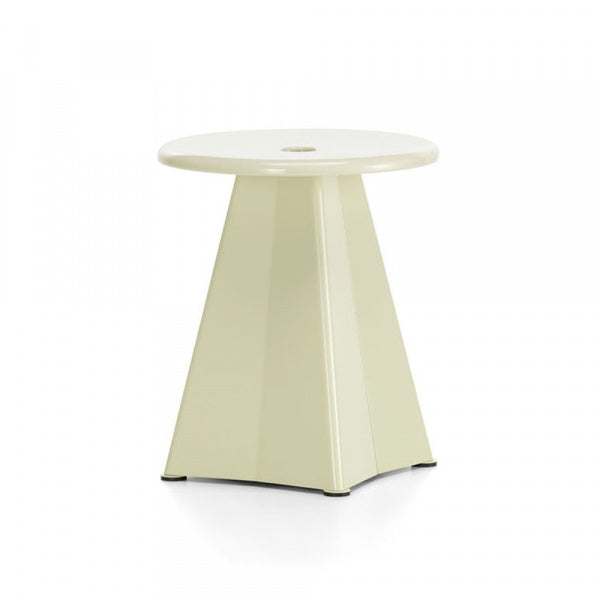 タブレ メタリークは、ジャン・プルーヴェがサン=モーリスの教育施設のためにデザインした金属製のスツールです。サイドテーブルとしても使用できる実用的なアイテムです。板金曲げ加工による湾曲したスチール板による座面を支える本体は、後にデザインされたトラぺーゼテーブルと親和性の高い構造です。