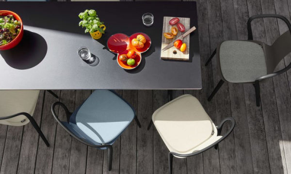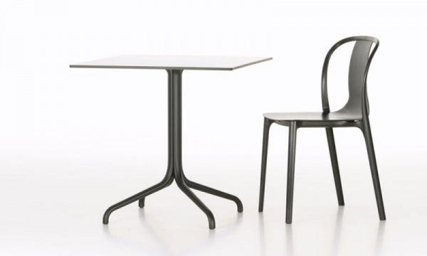 「ベルヴィル チェア」は、洗練された技術によってできたプラスチックチェアで、フレームとシートシェルから構成されています。スレンダーな黒のフレームは、脚や背面に向かって書道の線を思わせるようなラインを描いています。一方シートシェルは、広めの座面が背もたれにかけて細くなっていき、非常に薄いシェルを支えています。前方に向かってゆるやかにカーブした特長的な肘掛けのついたアームチェアタイプと、肘掛けのないアームレスタイプが選べます。プラスチック製のシートシェルは屋外でも使用できます。
