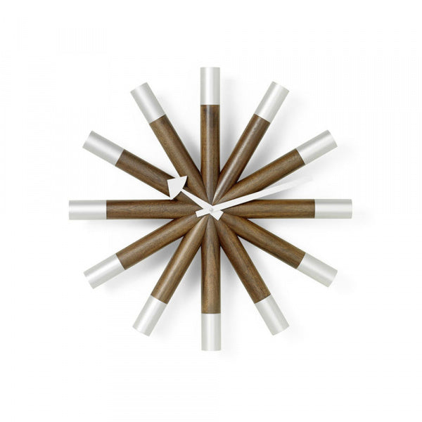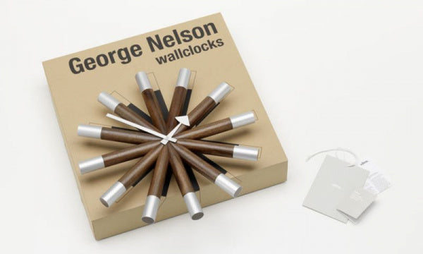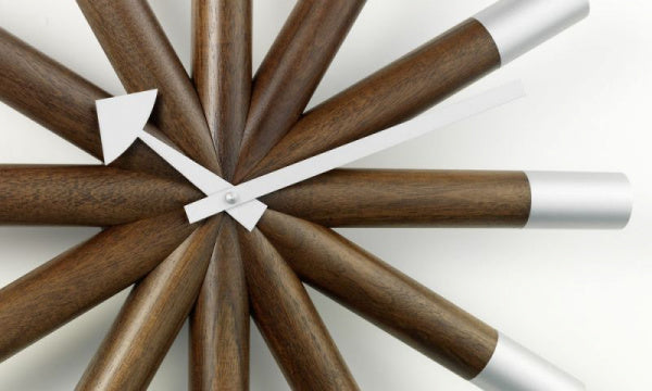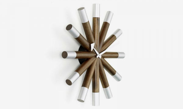 45.5cmの大きさのこの時計は、現代のオフィスや家庭のインテリアに調和し、洗練されたデスクや窓辺に映し出される姿が目に浮かぶようです。温かみのあるウォールナット材と異素材のアルミニウム材を使用し、スタイリッシュなデザインでお部屋に変化をもたらします。ホイールクロックは、汎用性の高いモダンなデザインであると同時に、アメリカのデザイン史の一部でもあるのです。ムーブメント:ドイツ、ユンハンス社製。【1948-1960年デザイン】【送料無料】