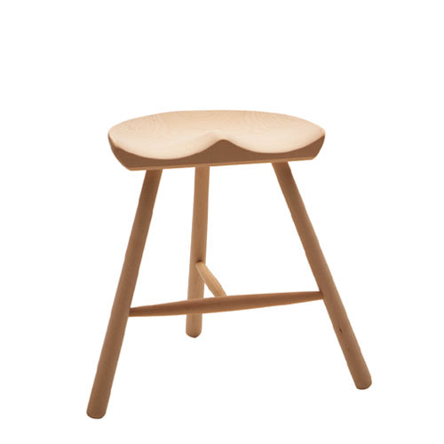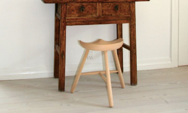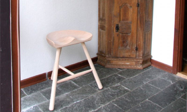 1970年代はじめに「シューメーカーチェア」の製作を始めたのは、現在のオーナーであるラース・ワーナーの父親でした。この3本脚のスツールの歴史は15世紀にさかのぼり、何世紀にもわたってわずかにそのかたちを変えたものの、平らな座面の牛の乳搾り用のスツールとして使われてきました。そのうちに、靴職人が座り心地を良くするためにお尻のかたちにあわせて削ったことがきっかけになり、それにインスピレーションを得て現在のかたちに近づきました。座面はお尻の形になっていて長時間座っていても疲れにくく、3本脚なのでがたつきにくい設計です。