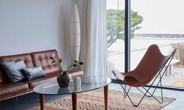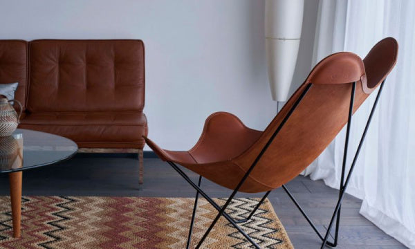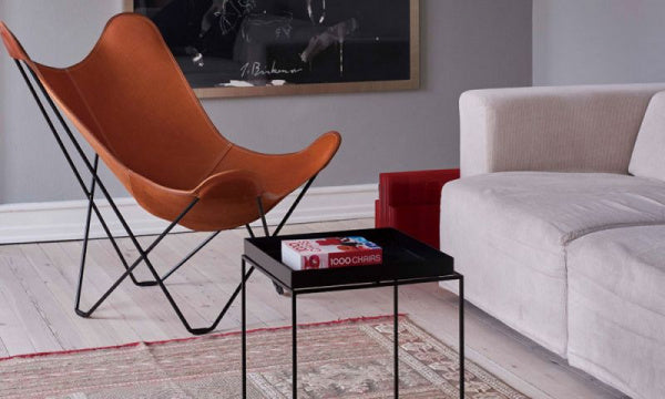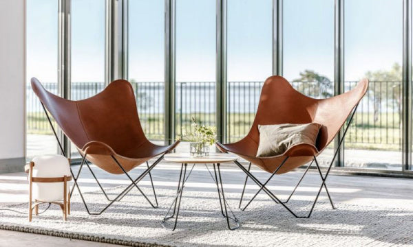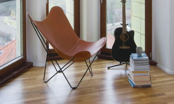 「バタフライチェア」の愛称でも知られる「BKFチェア」は、3人のアルゼンチン人デザイナー(アントニオ・ボネット、フアン・クルチャン、ホルヘ・フェラーリ=ハードイ)によってデザインされ、それぞれの頭文字をとってBKFチェアと名づけられました。彼らは20世紀を代表する建築家のル・コルビュジエの下で働いた経験を持ちますが、この椅子からはその影響はあまり感じられません。それよりも、イギリスのエンジニアのヨゼフ・フェンビィが1855年にデザインした椅子にインスピレーションを得て、1938年に誕生しました。1950年代から60年代にかけて特に若者たちに支持され、その人気はイームズ夫妻にも勝るとも劣らないものでした。組立式となります。