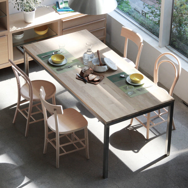 【納期2ヶ月~3か月】テーブルは食事をしたり、作業をしたりと日々の暮らしの中心になるもの。天然木の天板に、ステンレスの生地仕上げの脚を組み合わせた、シンプルなテーブルだからこそ木の材質やサイズを選ぶことで、自分らしさが生まれます。お値段そのままで、天板の幅をW1800~W1510mmの間10mm単位で、サイズオーダーいただけます。