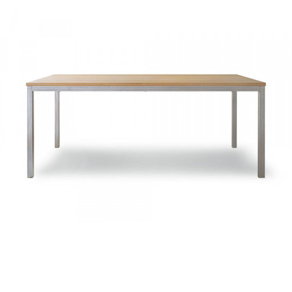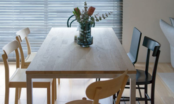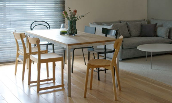 【納期2ヶ月~3か月】テーブルは食事をしたり、作業をしたりと日々の暮らしの中心になるもの。天然木の天板に、ステンレスの生地仕上げの脚を組み合わせた、シンプルなテーブルだからこそ木の材質やサイズを選ぶことで、自分らしさが生まれます。お値段そのままで、天板の幅をW1800~W1510mmの間10mm単位で、サイズオーダーいただけます。