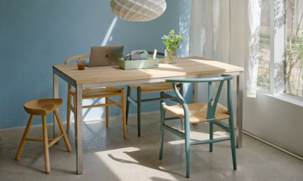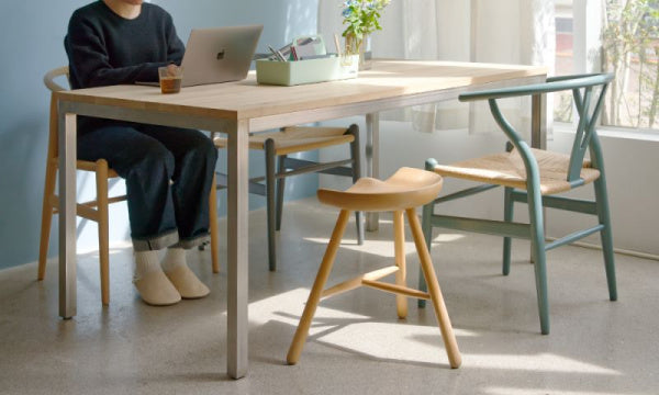 【納期2ヶ月~3か月】テーブルは食事をしたり、作業をしたりと日々の暮らしの中心になるもの。天然木の天板に、ステンレスの生地仕上げの脚を組み合わせた、シンプルなテーブルだからこそ木の材質やサイズを選ぶことで、自分らしさが生まれます。お値段そのままで、天板の幅をW1500~W1210mmの間10mm単位で、サイズオーダーいただけます。