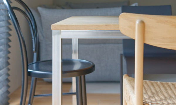 【納期2ヶ月~3か月】テーブルは食事をしたり、作業をしたりと日々の暮らしの中心になるもの。天然木の天板に、ステンレスの生地仕上げの脚を組み合わせた、シンプルなテーブルだからこそ木の材質やサイズを選ぶことで、自分らしさが生まれます。