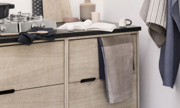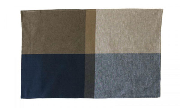 このディープブルーとブラウンの配色は、大地の水と木をイメージしたもの。リネン混なので毛羽立ちが少なくグラス拭きなどに向いています。ティータオルですがその大判のサイズを生かし、キッチン以外にもテーブルでマットにしたりバスルーム等でも使っても、インテリアの一部としてしっかり存在感を放ちます。バスケットに掛けたり、棚に敷いたり。質の良い素材かつ高級感のあるファブリックならではの使い方が可能です。※洗うと縮むため大き目に作られています。表記は洗濯後の目安サイズです。※ワークトップの素材によっては、濡れたまま置いておくと、色移りする場合がございます。