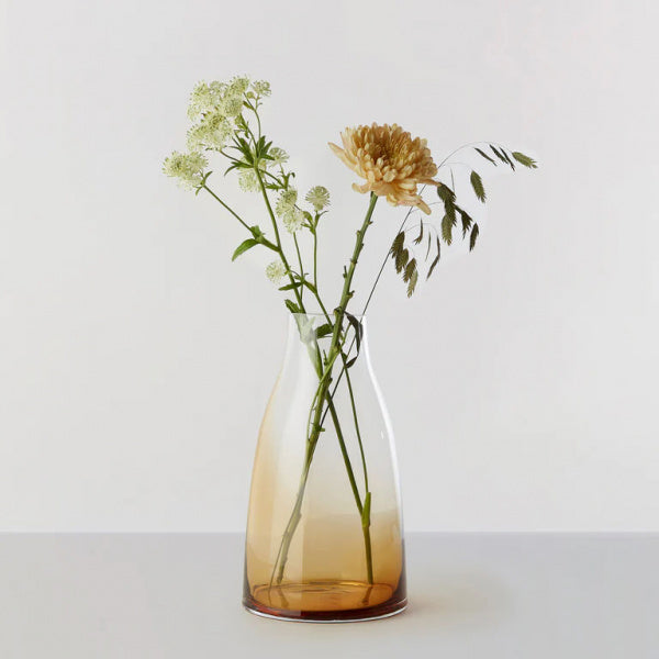 クリスタルクリアなガラスと、色のついたガラスが溶け合わさり、ガラス職人が伝統的なクラフトマンの技を用いて、溶けたガラスを魅力的な形に作り上げていきます。ハンドメイドであるため、色の出方や透明度、気泡の入り方などに個体差があり、それが一つ一つの製品に独特な表情を持たせ、世界で一つしかないユニークなものにしているのです。安定感のあるRoのフラワーベースは、下部に行くにつれ段々と色がついていき、花瓶の中の水を見えにくくすると共に、茎がガラスの色に徐々に溶け込んでいくように見えるデザインになっています。それはまるで、「自然」と「作品」が美しく機能的に溶け込んでいる様子を表しているようです。※商品に生花は含まれません。