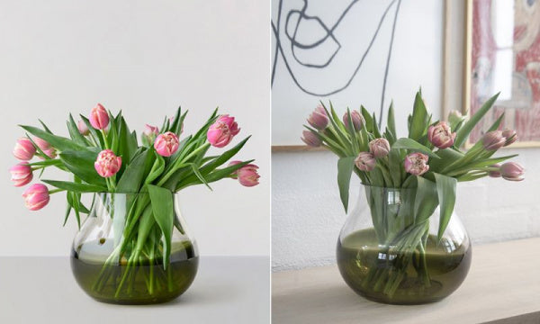 クリスタルクリアなガラスと、色のついたガラスが溶け合わさり、ガラス職人が伝統的なクラフトマンの技を用いて、溶けたガラスを魅力的な形に作り上げていきます。ハンドメイドであるため、色の出方や透明度、気泡の入り方などに個体差があり、それが一つ一つの製品に独特な表情を持たせ、世界で一つしかないユニークなものにしているのです。安定感のあるRoのフラワーベースは、下部に行くにつれ段々と色がついていき、花瓶の中の水を見えにくくすると共に、茎がガラスの色に徐々に溶け込んでいくように見えるデザインになっています。それはまるで、「自然」と「作品」が美しく機能的に溶け込んでいる様子を表しているようです。※商品に生花は含まれません。