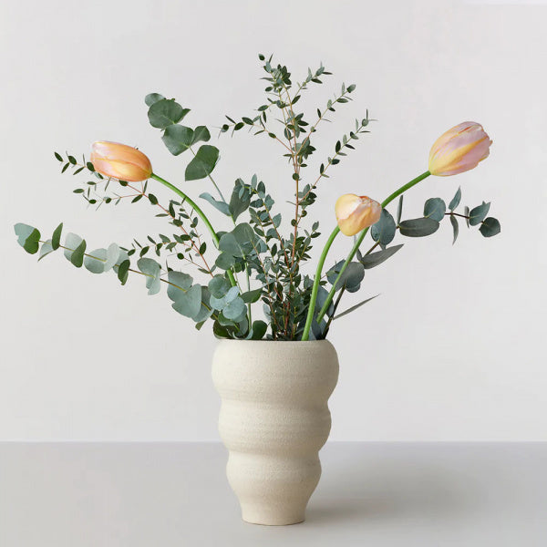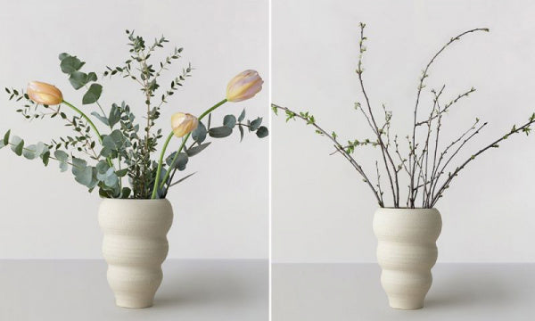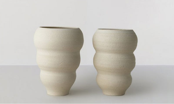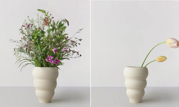 ろくろを使って手作業で作られた美しいフラワーベースです。このフラワーベースは、形と素材を粘土にしたことにより、強い個性を持ったユニークなものとなっています。まだら模様の粒状の粘土で作られ、窯で焼く前の粘土は黒っぽくて滑らかな感じですが、窯の中で1250度の熱を加えると、茶色の斑点のある明るい黄金色の粘土になります。表面は何も施されていないので、北欧の素朴な雰囲気を醸し出しています。100%手作業のため、一点一点が異なります。※商品に生花は含まれません。