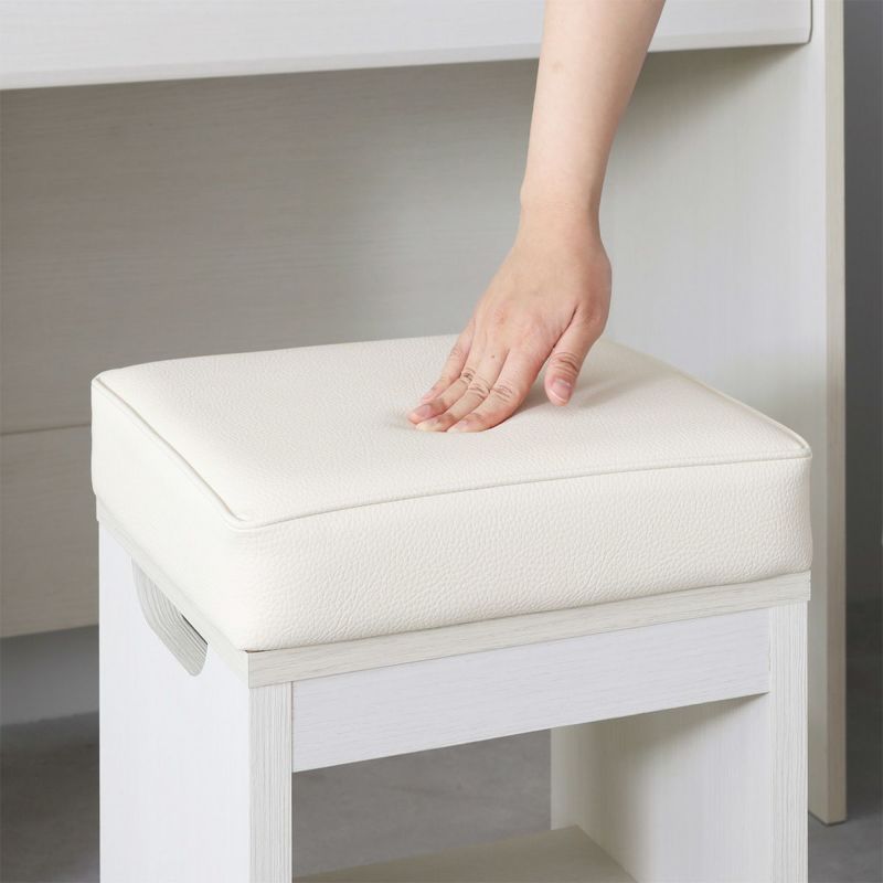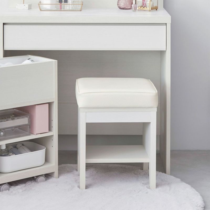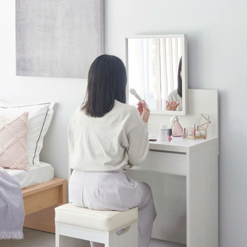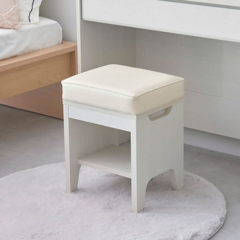 ドレッサーに合わせたシンプルなデザインのスツール。ちょうどいい高さで快適にメイクできます。クッション性のある座面は座り心地がよく、リラックスしてメイクができます。椅子の高さは46cm。ドレッサーの鏡に顔が映るちょうどいい高さです。