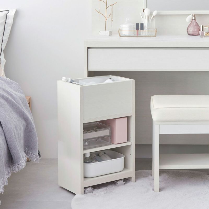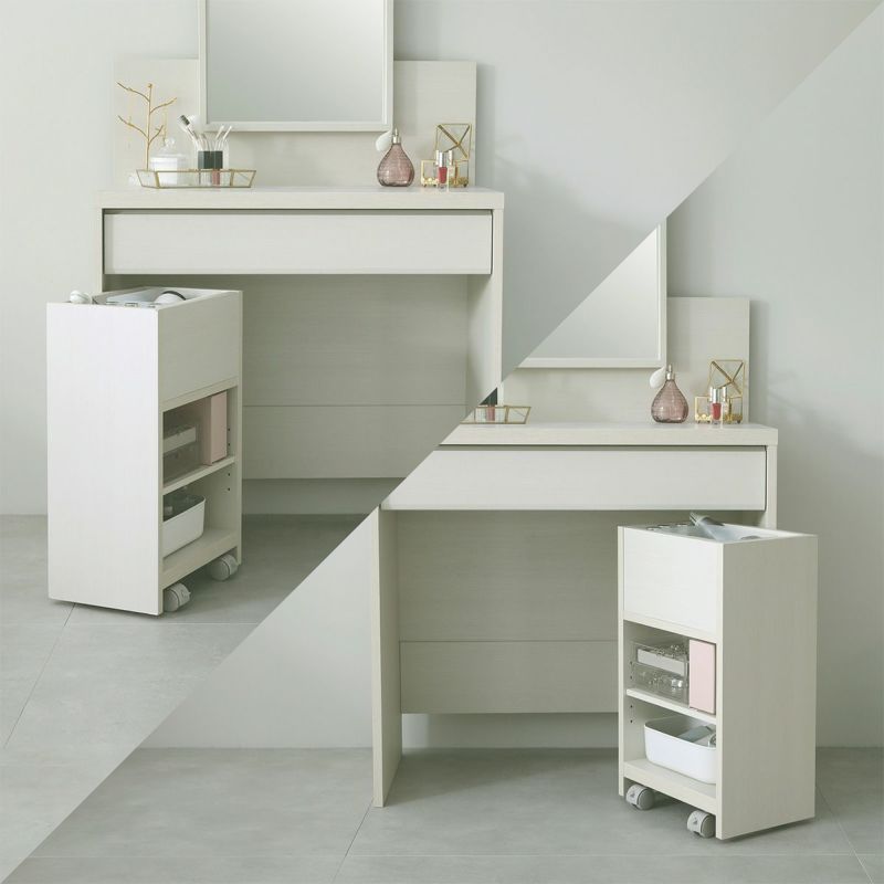 ドライヤーや化粧品ボトルなど大きな物を収納できます。ドレッサーの収納力をアップしてメイクしやすい環境をつくることができます。ワゴンはドレッサーの引き出し下スペースにぴったり収まるサイズ。使わないときはしまっておけるから邪魔にならず見た目もすっきりします。ワゴンは左右対称だから、左右どちらの向きでも使うことができます。ワゴン上部の内寸は幅29.5cm、奥行19.2cm、高さ16.6cm。ドライヤーやヘアアイロンなどの大きいモノの収納におすすめです。下部の収納には、ドレッサーの引き出しに入らないボトルやメイクポーチなどの収納におすすめ。コットンやメイクスポンジなどのストックにも最適です。棚板は3cm間隔で高さを調節できる移動棚です。収納したい物に合わせて棚の高さを決めることができます。出し入れに便利なキャスター付きです。そのうち2つにはストッパーも付いているので、ドレッサーから出して使うときには固定もできます。オプションで組立サービス(有料)が選択できます。専門スタッフが組み立てた、組立済みの商品を玄関までお届けします。