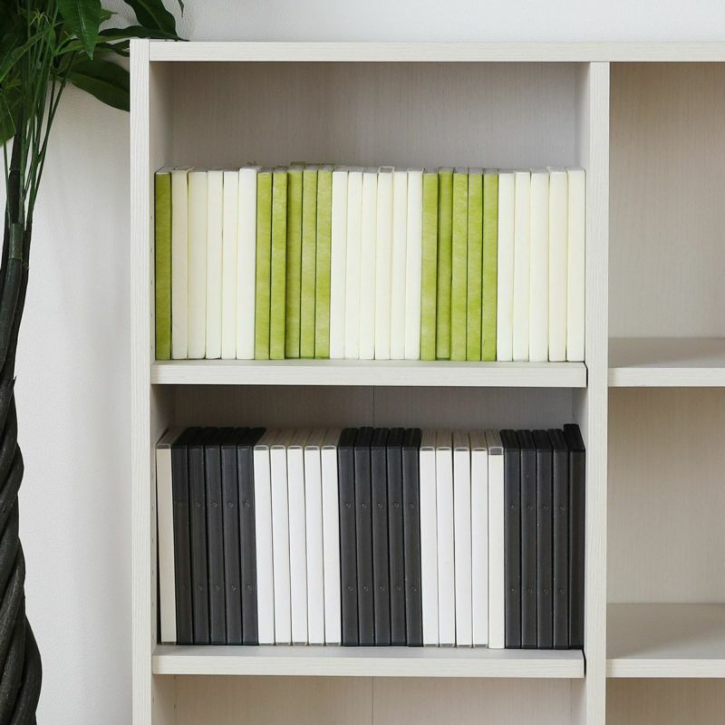 棚1段にDVDは約26本、コミックは約26冊を収納できます。木口には、木の凸凹まで再現した3Dエンボス加工のテープを使用しています。奥行きは約29cm。コミックや文庫本サイズなら前後に並べて収納ができます。
