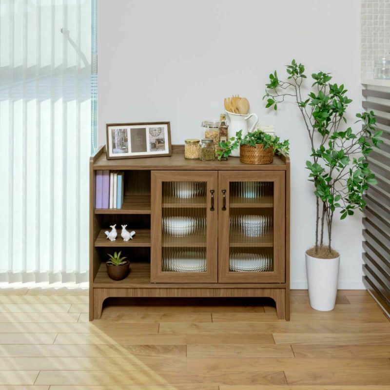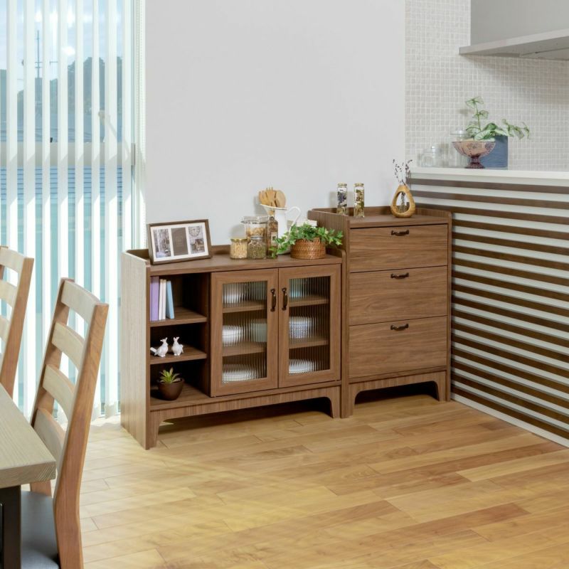 暖かみのある木目調のブラウンカラーと、細部のレトロチックなディテールが可愛らしいスタイルです。天板の3方を板で囲んでいます。上に物を置いても落ちにくい仕様です。収納物のシルエットを程よくぼかして生活感を隠してくれます。縦のラインがすっきりおしゃれな印象です。ちょこんとした見ためがかわいい取っ手。亜鉛合金製でレトロを感じさせるデザインです。大2枚、小2枚の棚板は可動式。収納物のサイズに合わせて3cm間隔で高さを調節できます。足元に空間をつくることで、軽快さと床面の広がりを感じさせます。オプションで組立サービス(有料)が選択できます。専門スタッフが組み立てた、組立済みの商品を玄関までお届けします。