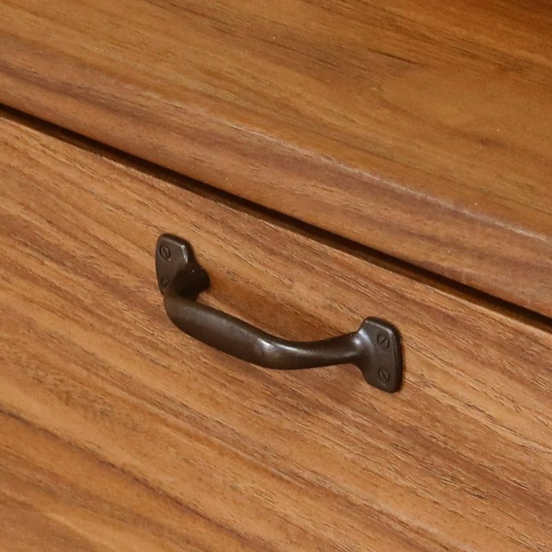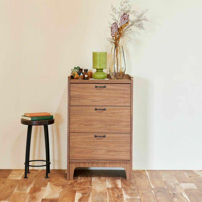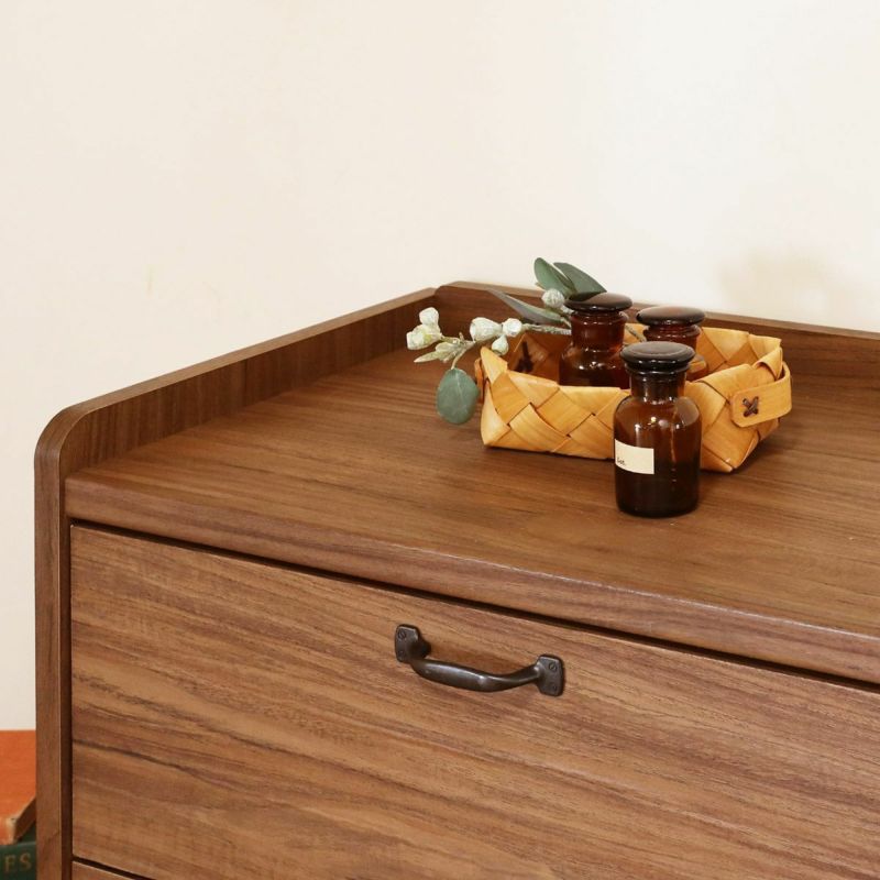 暖かみのある木目調のブラウンカラーと、細部のレトロチックなディテールが可愛らしいスタイルです。天板の3方を板で囲んでいます。上に物を置いても落ちにくい仕様です。ちょこんとした見ためがかわいい取っ手。亜鉛合金製でレトロを感じさせるデザインです。引き出しの内側も同じ柄のデザインに。引き出しを開けた時も統一感があります。金属レールを使った引き出しは滑らかな開閉。耐久性にも優れています。何度もくり返し開け閉めする引出は、専用パーツで耐久性をプラスしています。足元に空間をつくることで、軽快さと床面の広がりを感じさせます。オプションで組立サービス(有料)が選択できます。専門スタッフが組み立てた、組立済みの商品を玄関までお届けします。