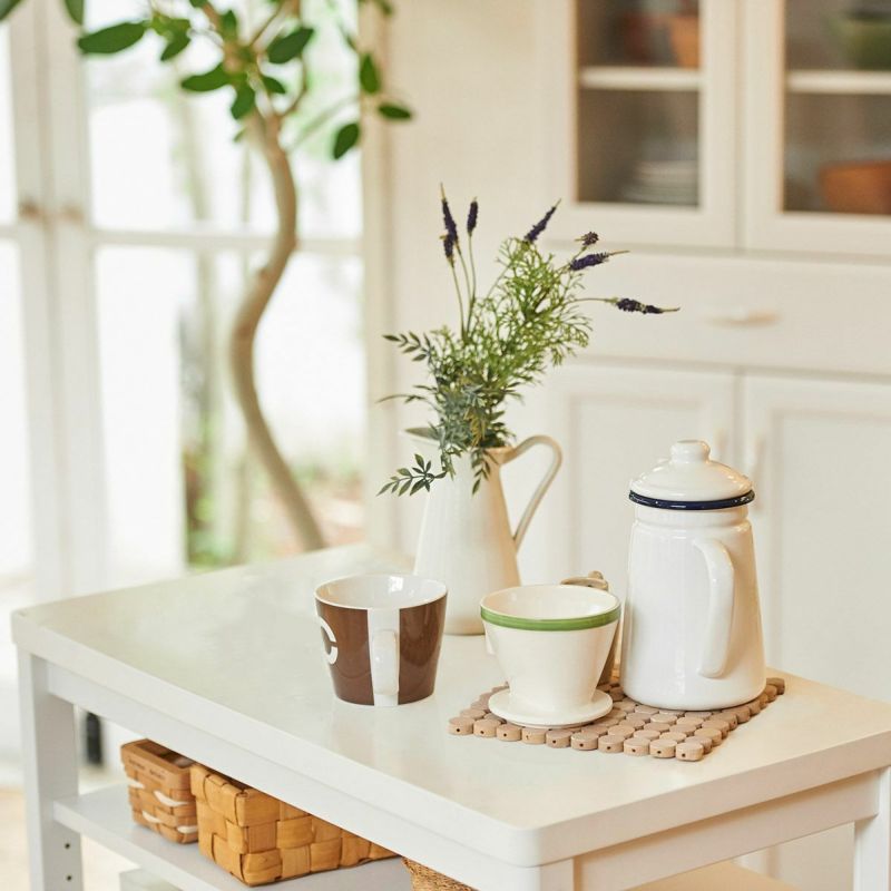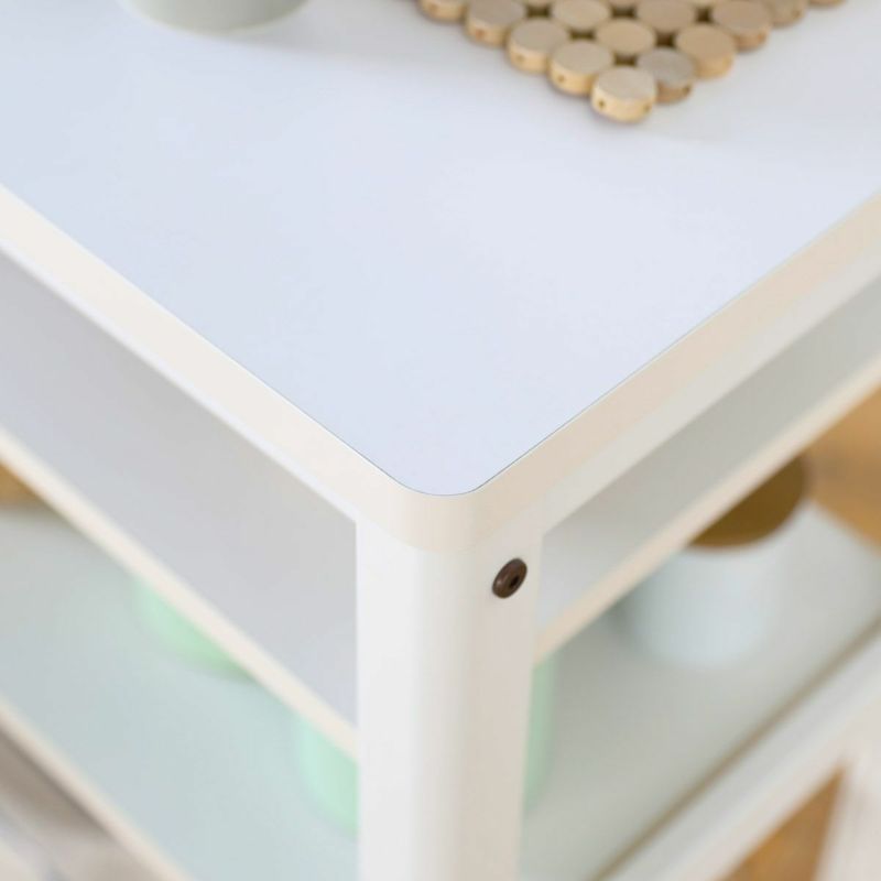 高さはシンクの高さと近い約85cmで、料理のサポート台として使用するときに作業しやすい高さ設計です。天板は傷に強いメラミン化粧板。傷に強いだけでなく、熱や変色にも強いという特徴があります。やさしい丸みをもたせた天板。ぶつかっても痛くない、安心・安全のデザインです。可動式の棚板は1枚。収納物のサイズに合わせて位置を調節できます。中棚は収納物に合わせて取り付け位置を2か所から選べます。使わない取付穴を隠せるキャップ付きです。下段の棚には約4.2cmの深さのこぼれ止め。動かしても物が落ちにくくて安心です。移動に便利なキャスター付きです。そのうち2つのキャスターにはストッパー。作業するときに固定ができます。ホワイト色とダークブラウン色の2色から選べます。オプションで組立サービス(有料)が選択できます。専門スタッフが組み立てた、組立済みの商品を玄関までお届けします。