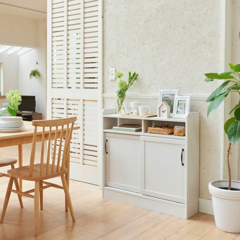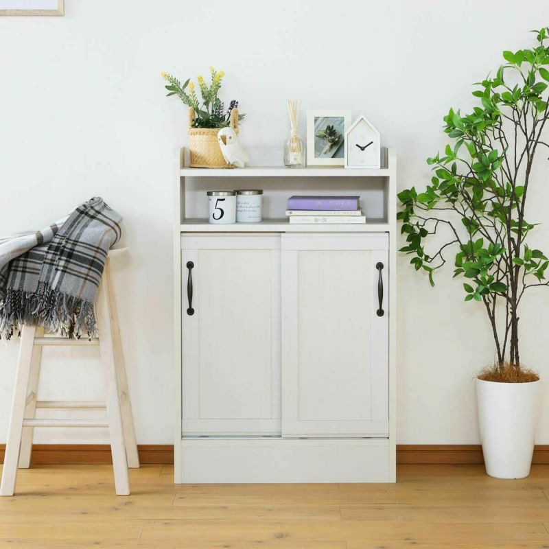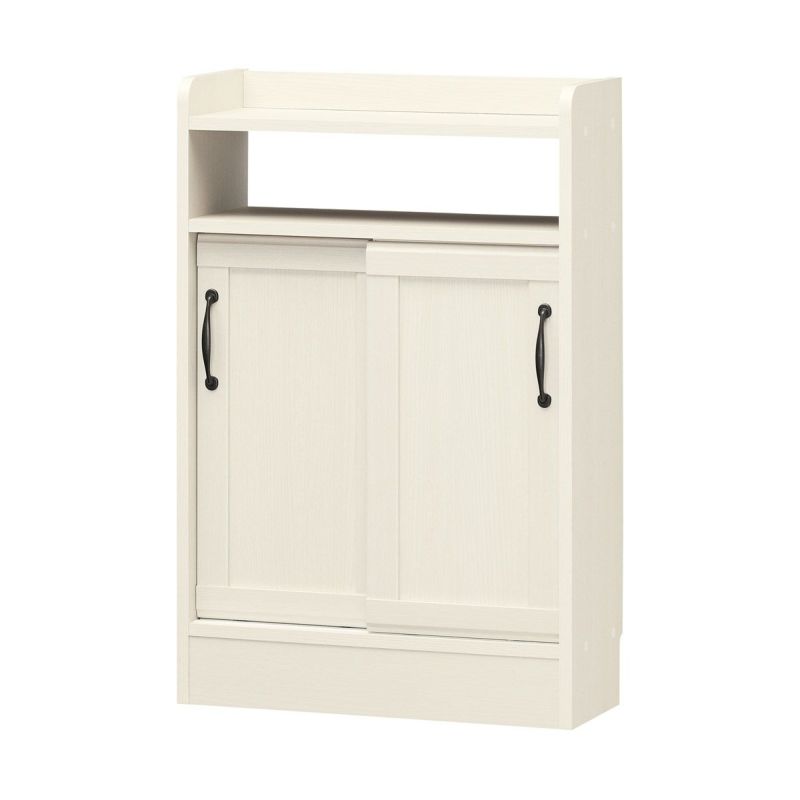 キャビネット 棚 幅57cm 高さ86cm ホワイト 白木目 カウンター下 薄型 引き戸 収納