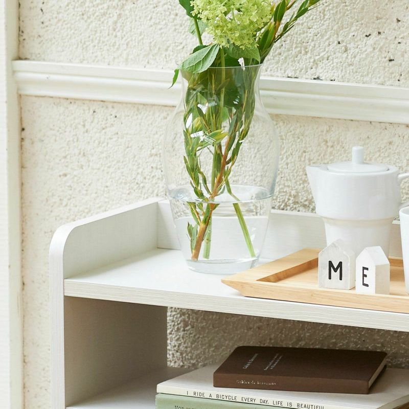 奥行き22.4cmの薄型タイプ。狭い廊下や玄関に置いて小物や文庫本などを収納するのに便利です。天板の3方を板で囲んでいます。上に物を置いても落ちにくい仕様です。薄いオーク柄の木目シート。